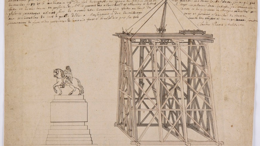 Le Musée d'histoire de Lyon de Gadagne a annoncé ce mardi avoir fait la récente acquisition d'un dessin accompagné d'un texte manuscrit de Claude Perret. Le croquis réalisé par l'architecte actif à Lyon entre 1701 et 1731 représente l'échafaudage et la machinerie qui ont permis la pose de la statue équestre de Louis XIV sur son piédestal de la place Louis le Grand (aujourd'hui Bellecour) les 27 et 28 décembre 1713.