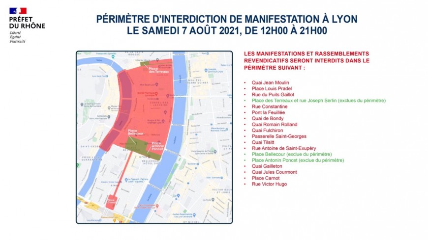 Cependant, les places des Terreaux, Bellecour et Antonin-Poncet sont bien exclues du périmètre, contrairement aux quais du 5e arrondissement. Le cortège déclaré devra donc s’arrêter sur la plus grande place de Lyon et non pas devant le Palais des 24 colonnes, comme cela était prévu.