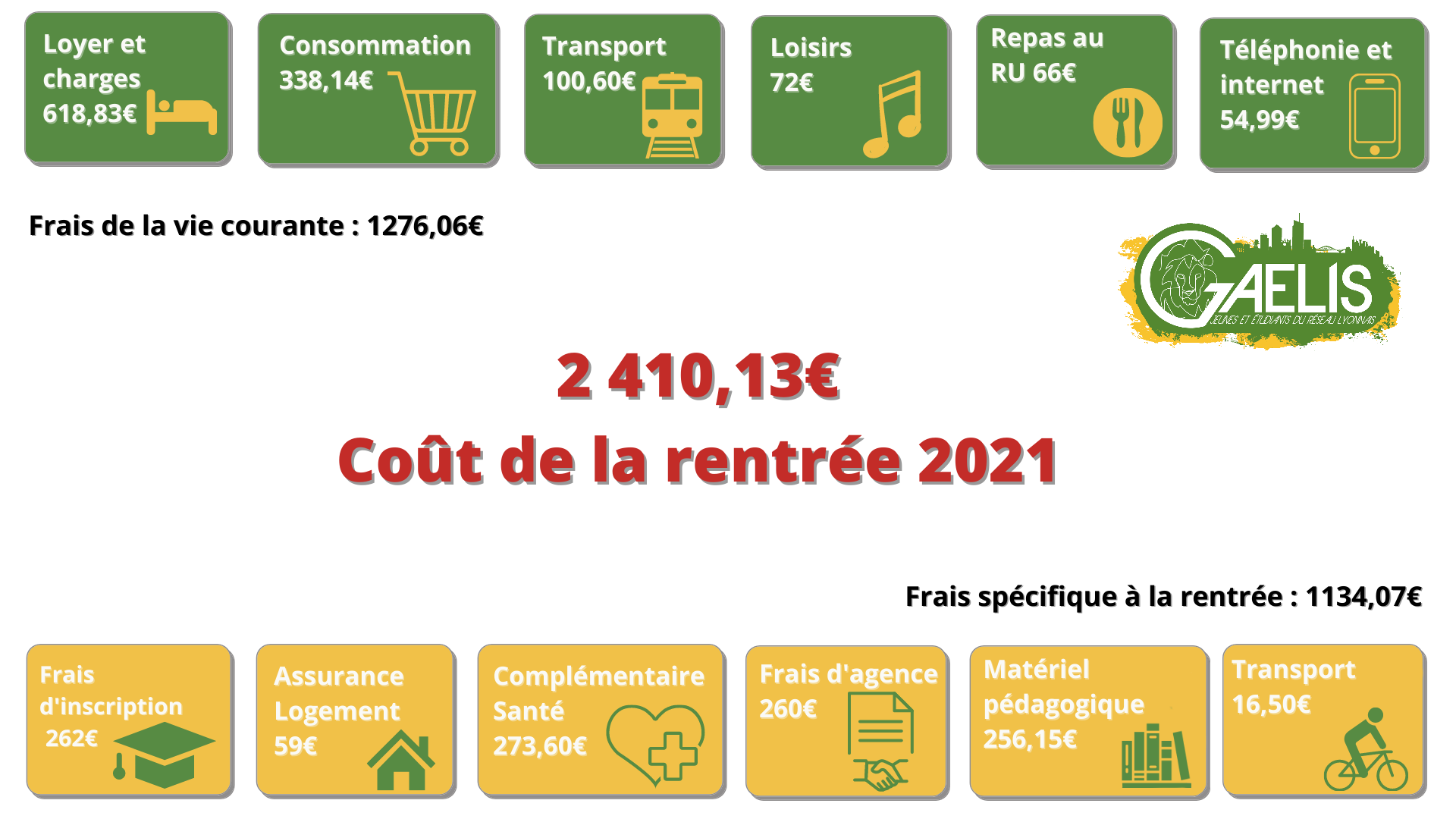 En septembre 2021, Gaelis estime qu’un étudiant lyonnais devra débourser en moyenne 2410,13 euros. Ce montant est calculé sur la base de plusieurs sources de dépenses qu’on peut regrouper en deux catégories : les frais liés à la vie courante et ceux spécifique à l’exercice étudiant.