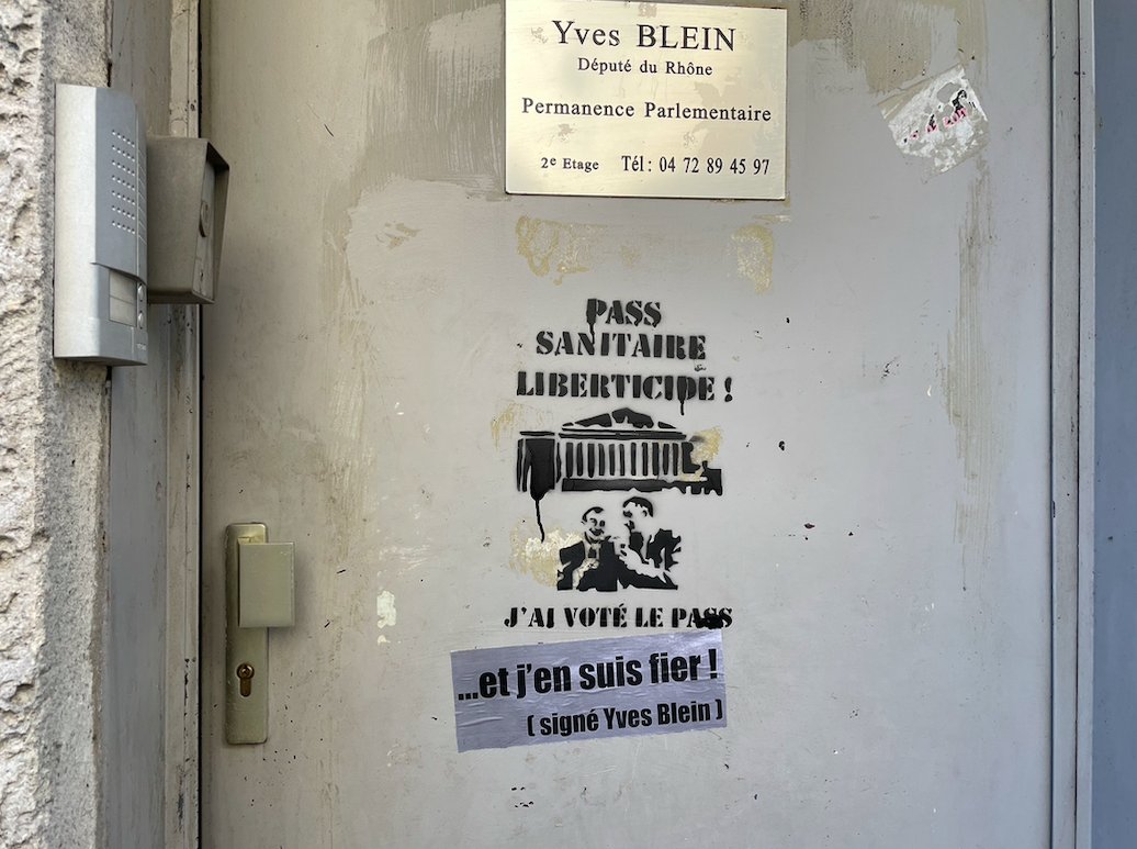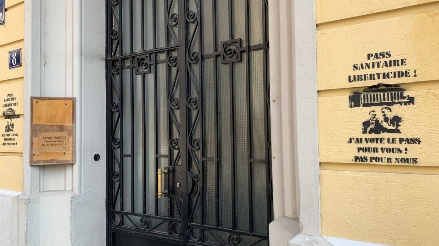 Thomas Rudigoz, déjà ciblé par des menaces de mort pour ces prises de position pro-vaccin, a publié sur Twitter une photo de sa permanence tagguée. "Pass sanitaire liberticide. J'ai voté le pass pour vous, pas pour nous", est-il inscrit à la peinture noire.