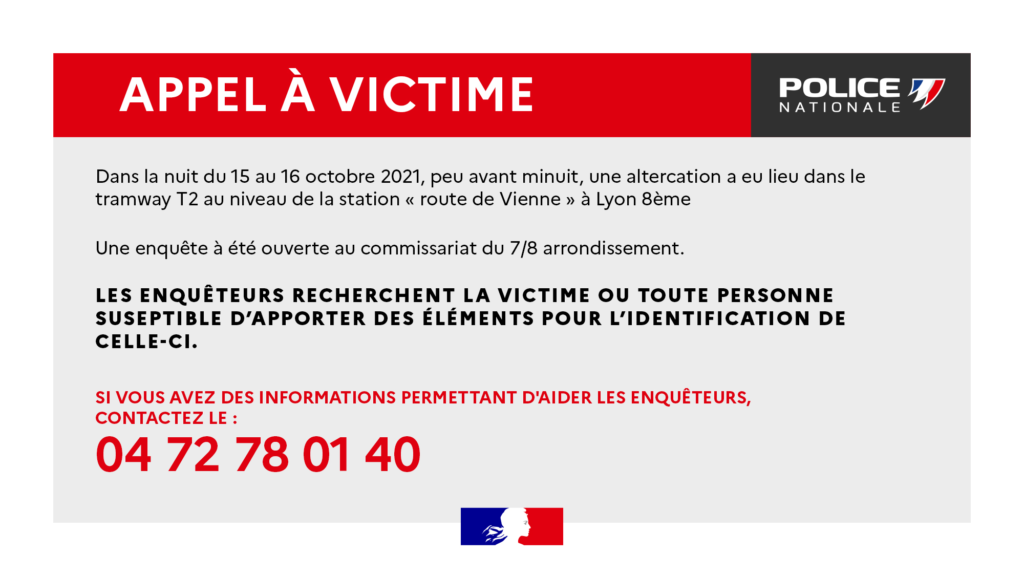 Aucune plainte n'a encore été déposée. C'est la raison pour laquelle les enquêteurs du commissariat des 7e et 8e arrondissements lancent un appel à témoins. Ces derniers espèrent retrouver la victime ou toute personne susceptible de pouvoir apporter des éléments sur les faits. Un numéro a été communiqué, il s'agit du 04 72 78 01 40.