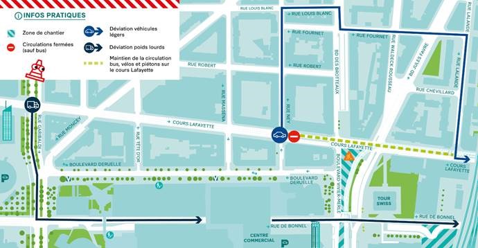 Pendant la durée des travaux, la circulation des bus, des vélos et les cheminements piétons sera maintenue. Mais des déviations routières seront mises en place pour les véhicules venant depuis l'ouest. Les poids-lourds seront redirigés vers les rues Garibaldi et Bonnel et les voitures iront vers les rues Ney, Louis Blanc, Fournet et Lalande. "Une attention très particulière et un dispositif de limitation de vitesse sera mis en oeuvre sur cet itinéraire", préviennent les services de la collectivité.