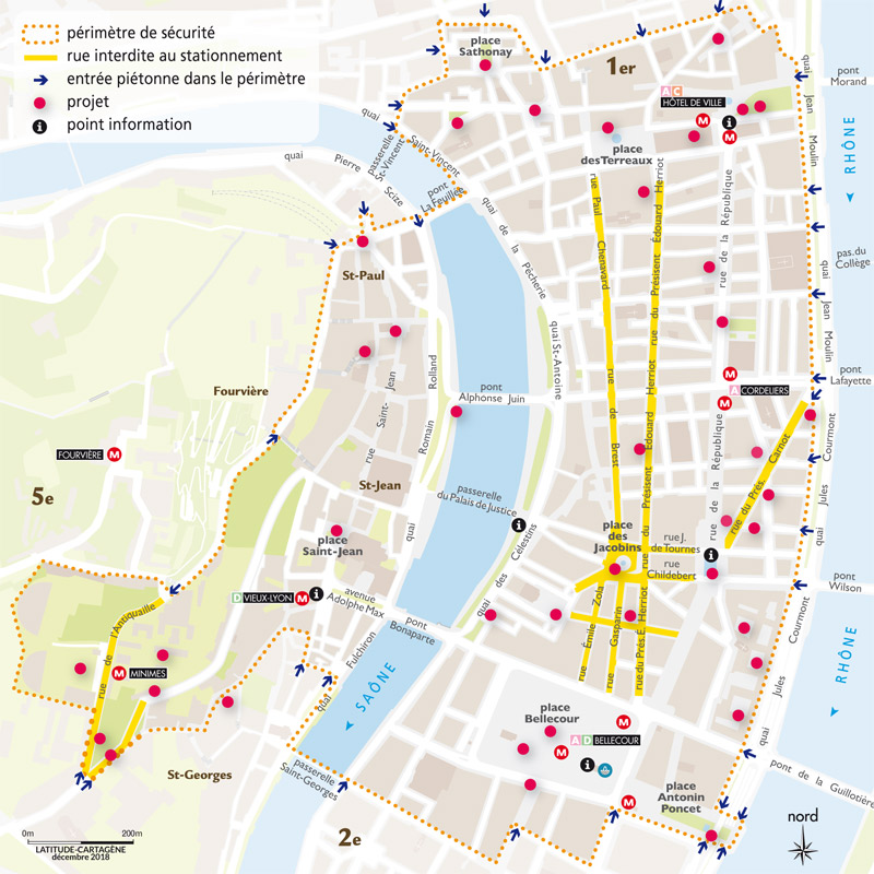 Comme le montre un plan, un périmètre de sécurité a été instauré dans les 1er, 2e et 5e arrondissements de la capitale des Gaules. Seul les piétons et les transports en commun auront le droit de se déplacer à l'intérieur de celui-ci en soirée.