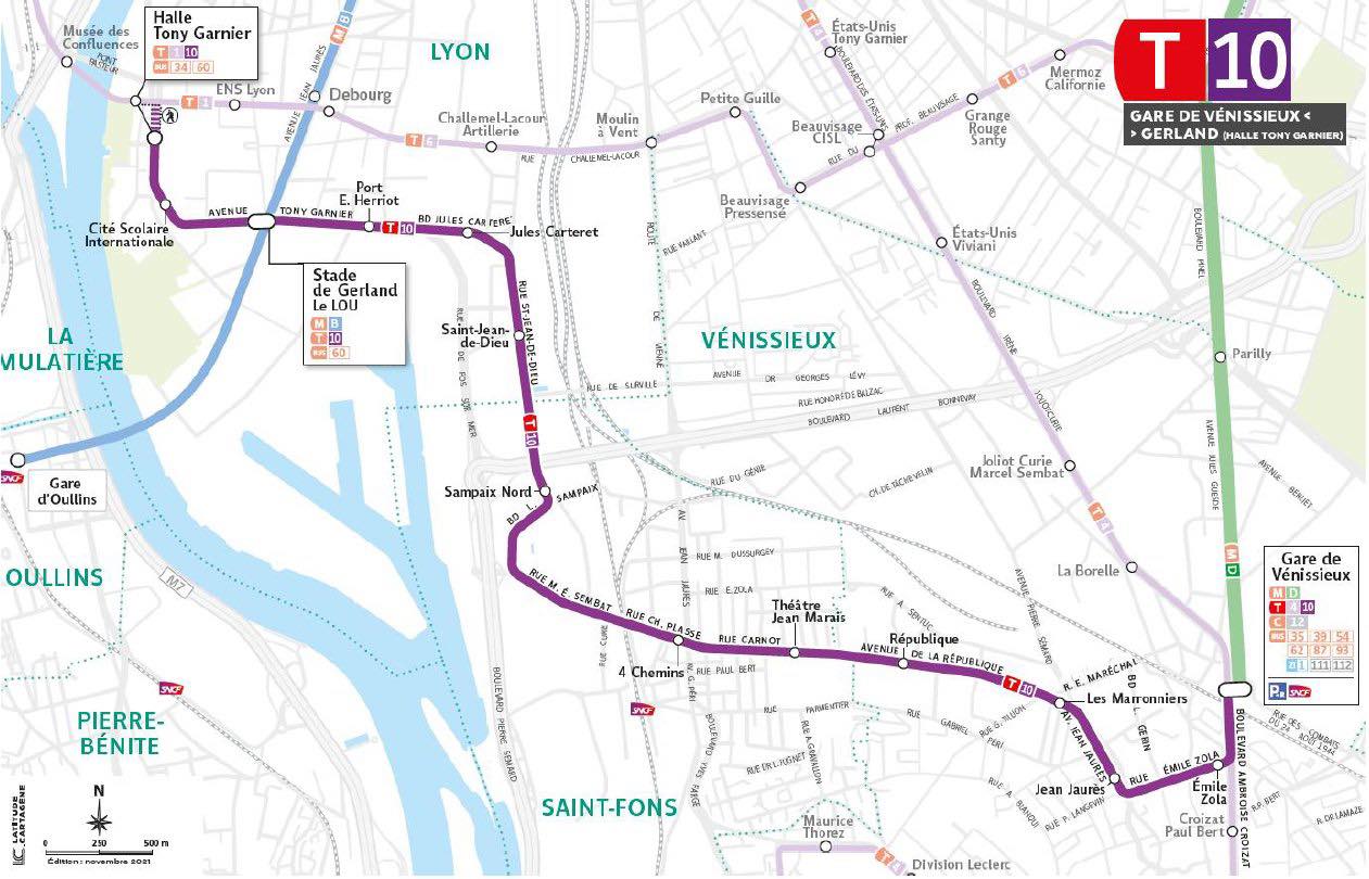Concernant le T10 (14 stations créées), qui reliera le quartier de Gerland à Lyon à Vénissieux en passant par Saint-Fons en 2026, le tracé retenu passera par l'avenue Jean-Jaurès plutot que le boulevard Laurent Gérin.