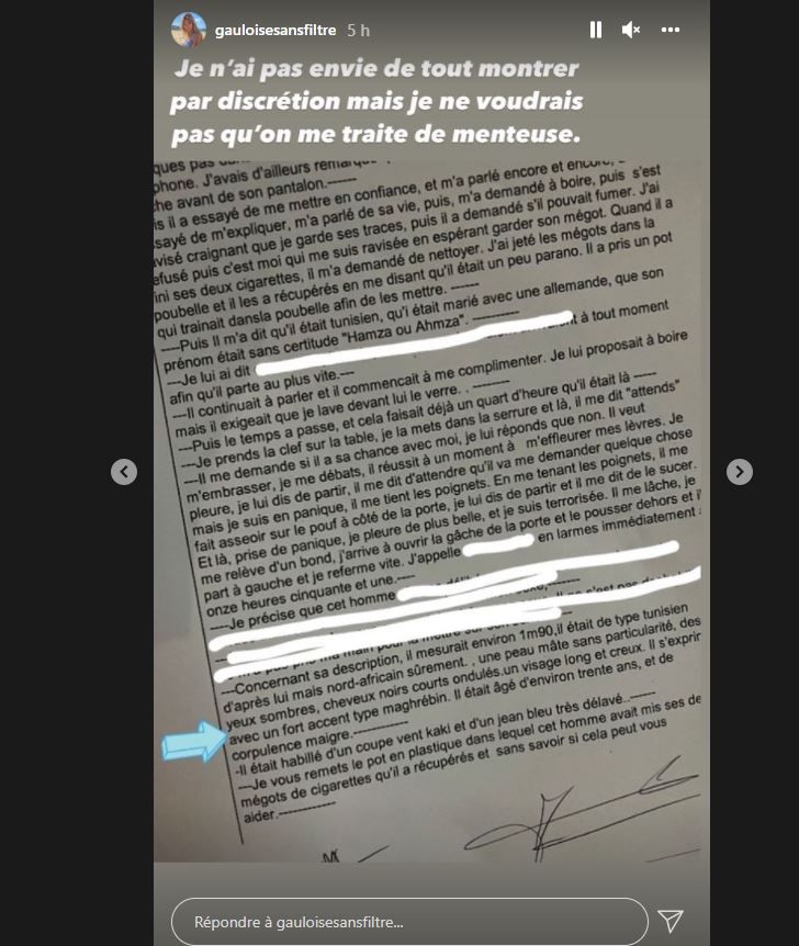 Un peu plus tard, Thaïs d'Escufon a décidé d'aller porter plainte. Elle a d'ailleurs publié une partie du procès-verbal sur les réseaux sociaux pour appuyer ses arguments. Contactée par Libération, la présumée victime a indiqué que les faits ne se sont pas produits à Toulouse mais dans une ville où elle a ses habitudes.