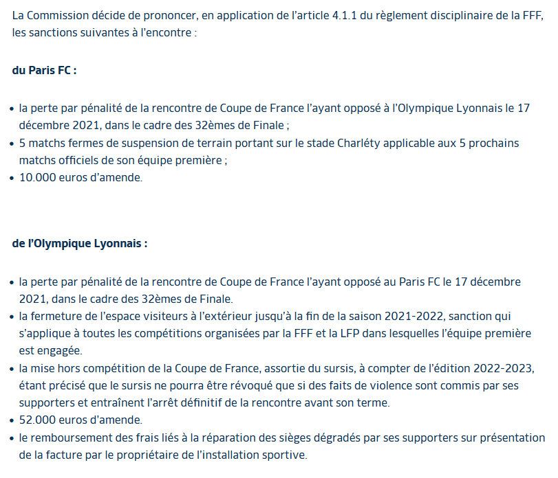 Signaler Répondrele paris FC paye bien la note avec elimination + 5 matches suspensions terrain. L’OL s’en sort tres bien.