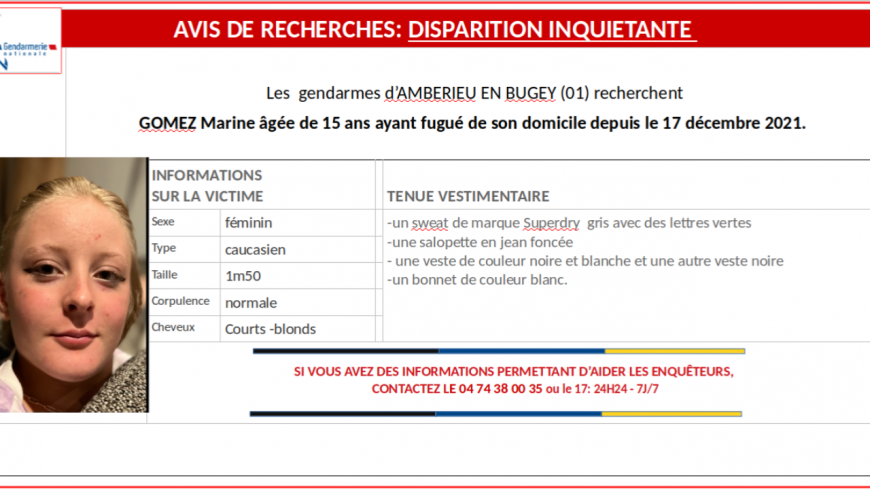 Marine Gomez, âgée de 15 ans, a quitté le domicile de ses parents à Ambérieu-en-Bugey dans l'ain.