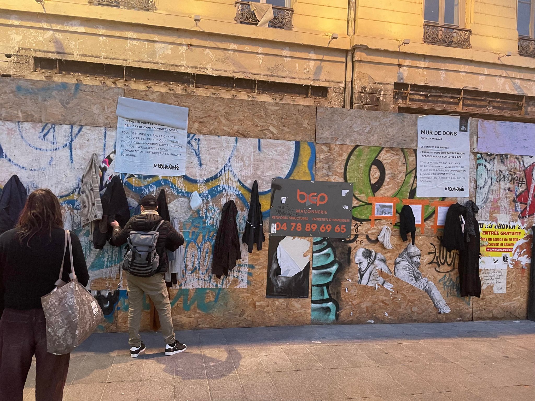 Situé à l’angle de la rue de la République et de la rue Childebert dans le 2e arrondissement, ce mur constitué de porte-manteaux a pour objectif d’encourager le don de vêtements chauds alors que le froid glaçant persiste sur Lyon depuis plusieurs semaines.