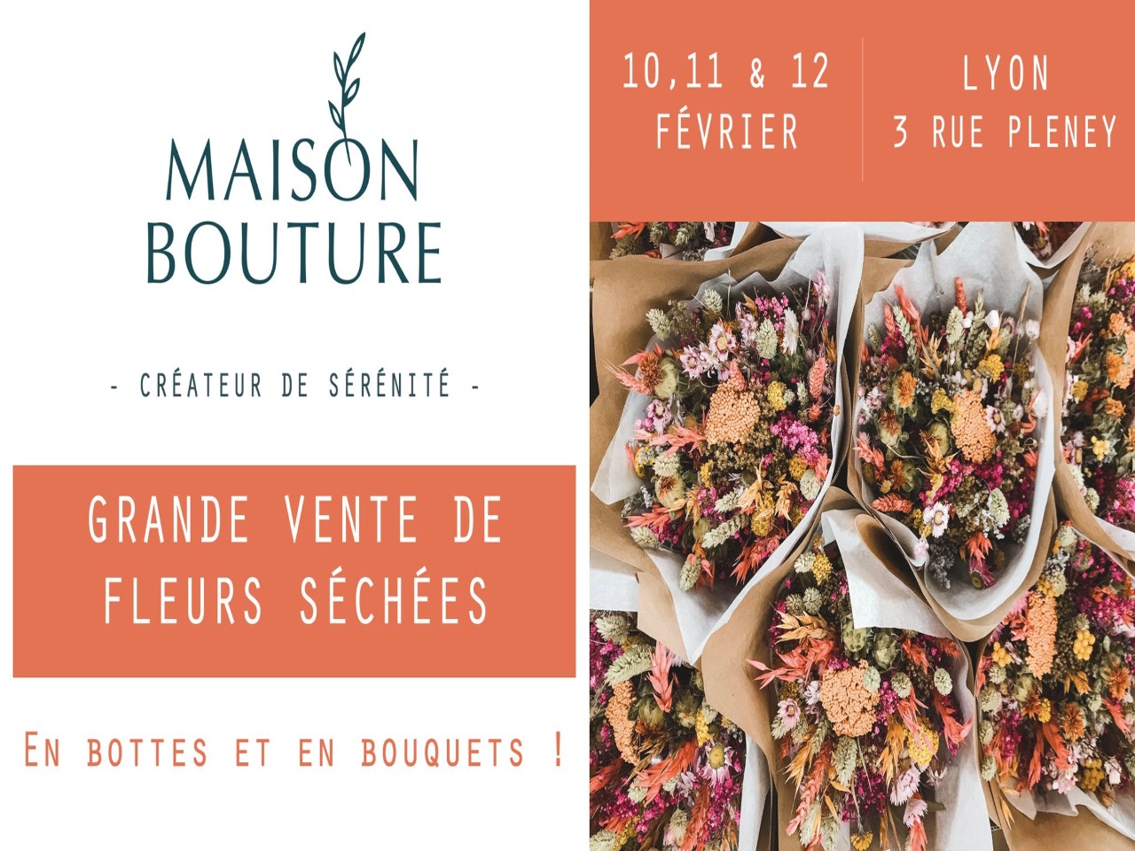 La Saint-Valentin approche ! A l’occasion de la fête des amoureux, la Maison Bouture organise une grande vente de fleurs séchées. Le rendez-vous est donné jusqu’à samedi de 10h à 19h au 3 rue Pleney. A saisir : des bouquets, des couronnes et des bottes de fleurs séchées. Vous n’aurez plus d’excuses ! Les informations pratiques ici
