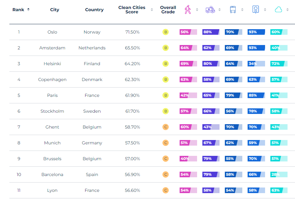 Clean Cities évalue les villes sur cinq critères définis : “L’espace disponible pour les citadins, la sécurité des routes, l’accès aux mobilités respectueuses de l’environnement, la politique de la ville, et enfin la qualité de l’air,” précise le site internet de l’ONG. Les scores sont établis pour chacun de ces critères, basés sur la longueur des trottoirs et des pistes cyclables comparé à la longueur totale des routes, sur le nombre de piétons et cyclistes tués en l’espace de 3 ans comparé au nombre d’habitants total de la ville, sur l’accessibilité des transports en commun et des véhicules électriques, sur la présence de zones à faibles émissions l’élimination progressive des ventes de voitures polluantes et sur les concentrations moyennes annuelles en 3 ans de dioxyde d’azote et autres particules fines dans l’air.