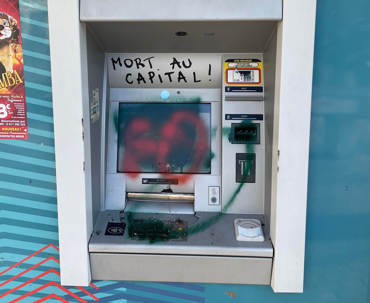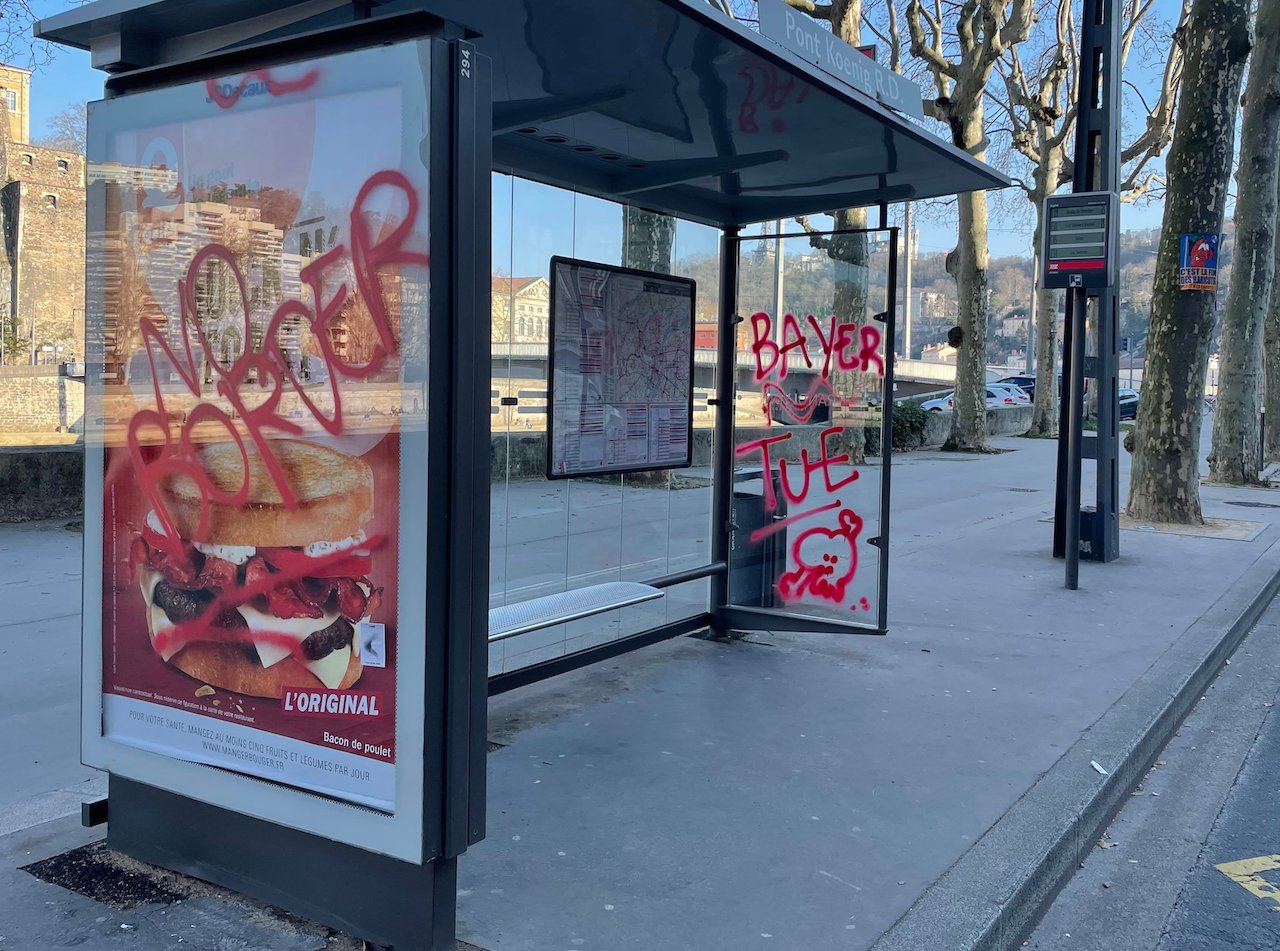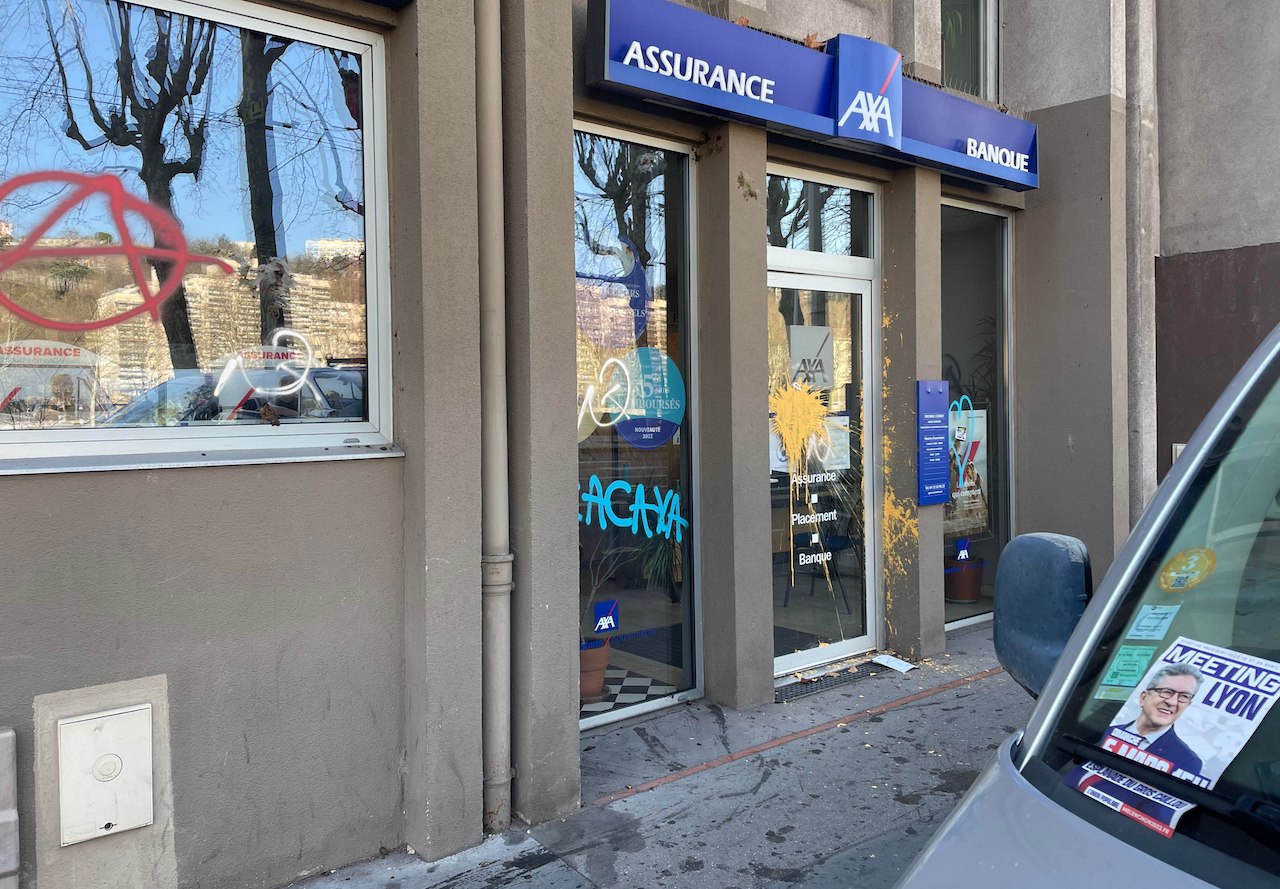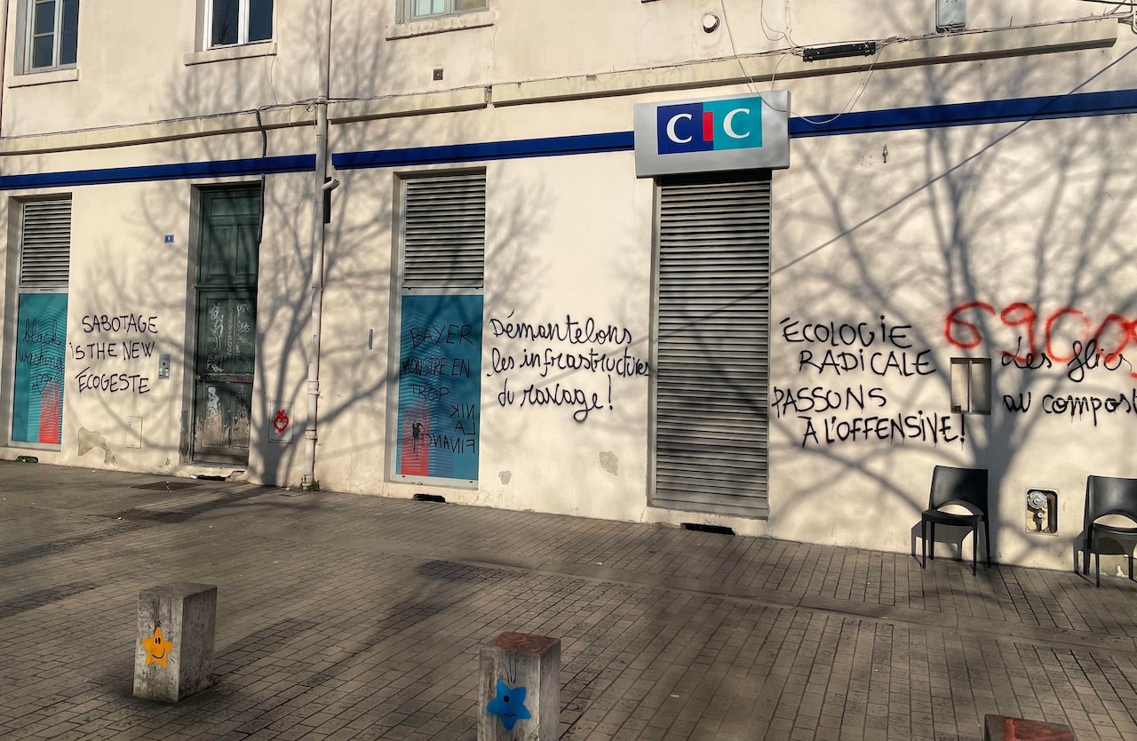 Comme souvent, les banques et leurs DAB ont été particulièrement visés. Mais plusieurs mètres de façades d'immeubles ont également subi les foudres gratuites des opposants à Bayer les plus zélés.