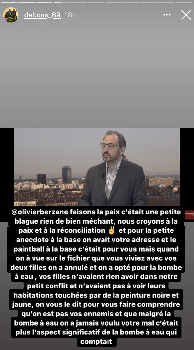 "A la base, on avait votre adresse et le paintball c’était pour vous. Mais quand on a vu sur le fichier que vous viviez avec vos deux filles, on a annulé et on a opté pour la bombe à eau. Vos filles n’avaient rien à voir dans notre petit conflit et n’avaient pas à voir leur habitation touchée par de la peinture noire et jaune", détaillent les Daltons.