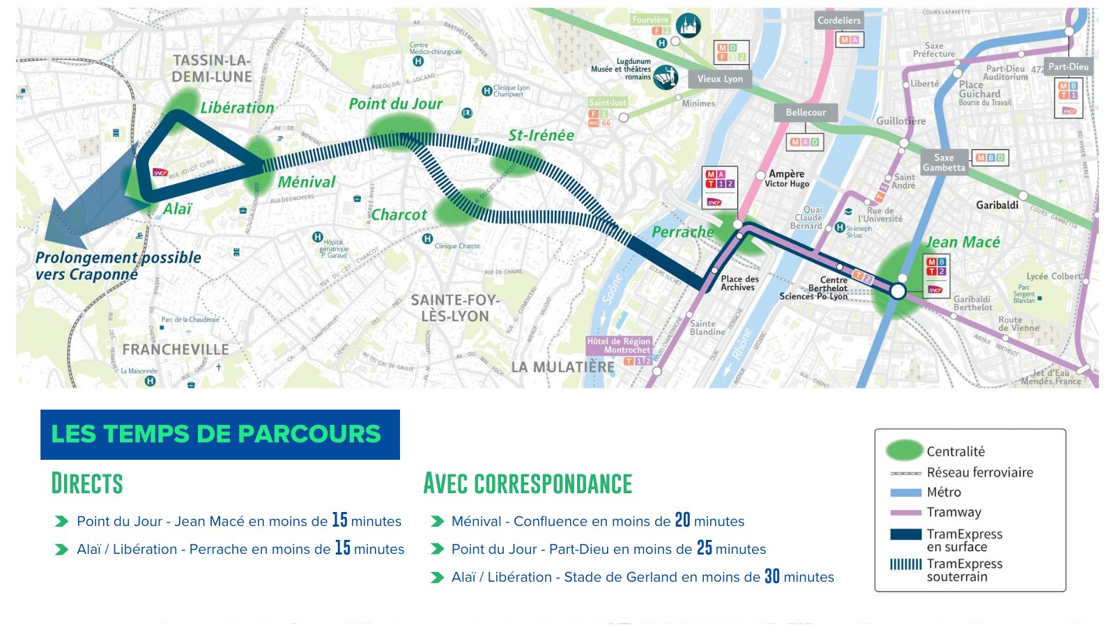 Concrètement, et carte à l'appui, le président EELV de la Métropole de Lyon entend faire partir la ligne de la place Jean-Macé en utilisant le réseau existant de tram jusqu'à Perrache. Puis projeter les rails jusqu'à la Saône où la partie enterrée débutera à leur arrivée sur le quai d'en face à la Mulatière. Se posera la question de desservir Saint-Irénée ou Charcot avant d'arriver à Point-du-Jour, Ménival puis la gare d'Alaï, avec un prolongement possible à l'avenir jusqu'à la commune de Craponne. "À l’est, la possibilité d’emprunter les infrastructures existantes offre de nombreuses perspectives", note Bruno Bernard. Le tracé définitif de ce "tramway express" tout comme la fréquence de passage seront actés en 2023 après concertation des citoyens et des élus.