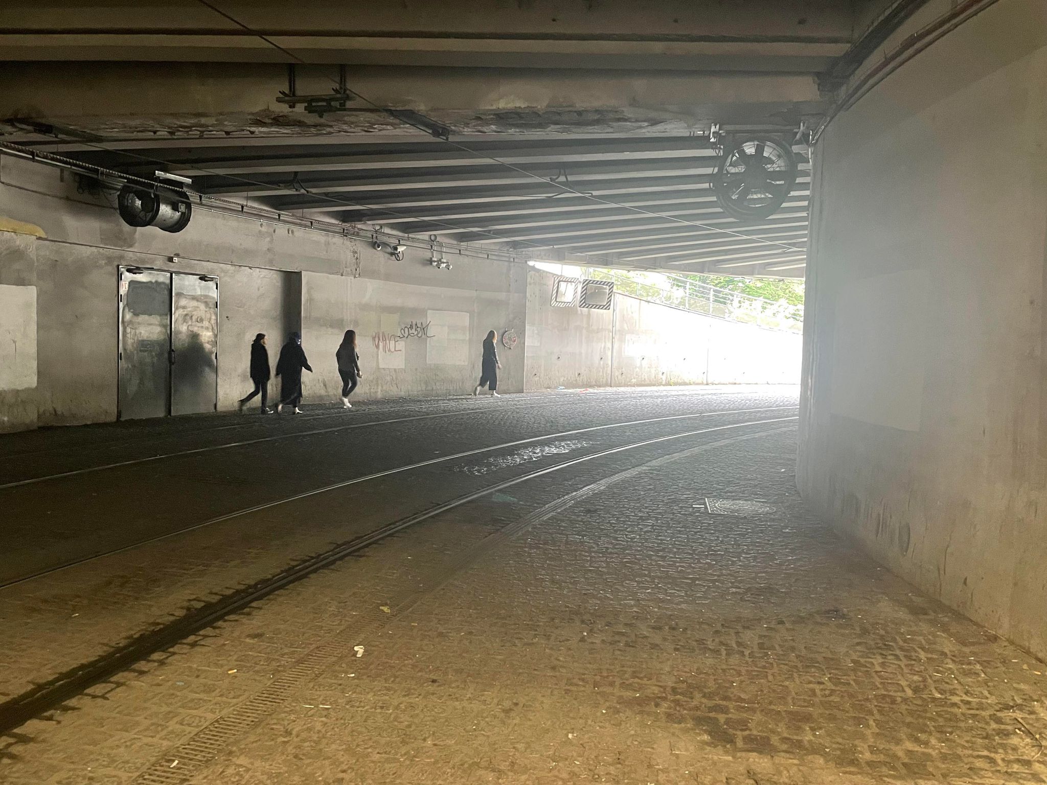 Un peu plus loin, après être passé par les effluves d’urine dans les couloirs, des inscriptions phosphorescentes ont aussi été installées du côté de la sortie piétonne qui traverse les voies du tramway. Chaque nuit, et durant 10 heures, ces marquages rappellent qu’il faut faire le tour de la plateforme pour accéder aux rames.