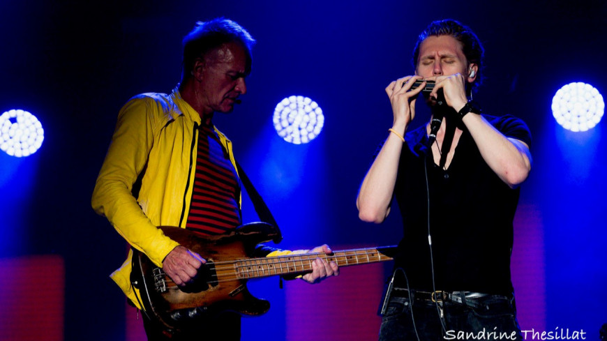 Veste jaune sur pantalon noir, le chanteur britannique a enchainé ses plus grands tubes sur une basse dont il ne reste quasiment plus aucune trace de vernis. Les 15 000 spectateurs présents ont ainsi pu profiter d'une ambiance intimiste lors de Fields of Gold, se déhancher sur So Lonely tout en se replongeant dans les années 80 avec Every breath you take. Le tout accompagné par tout un groupe de musiciens qui ont su mettre en valeur la voix suave et éraillée de l'ancien membre de The Police.