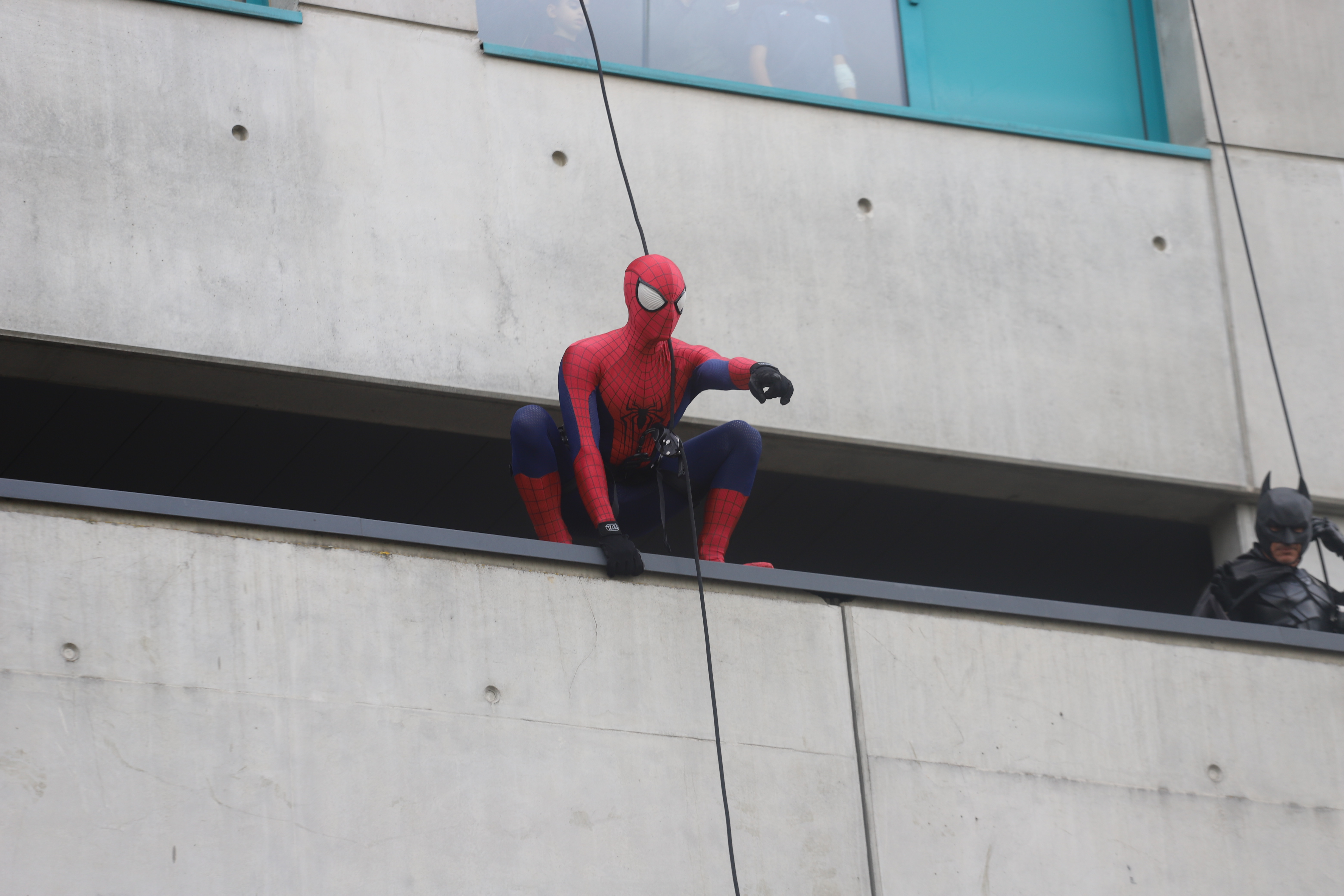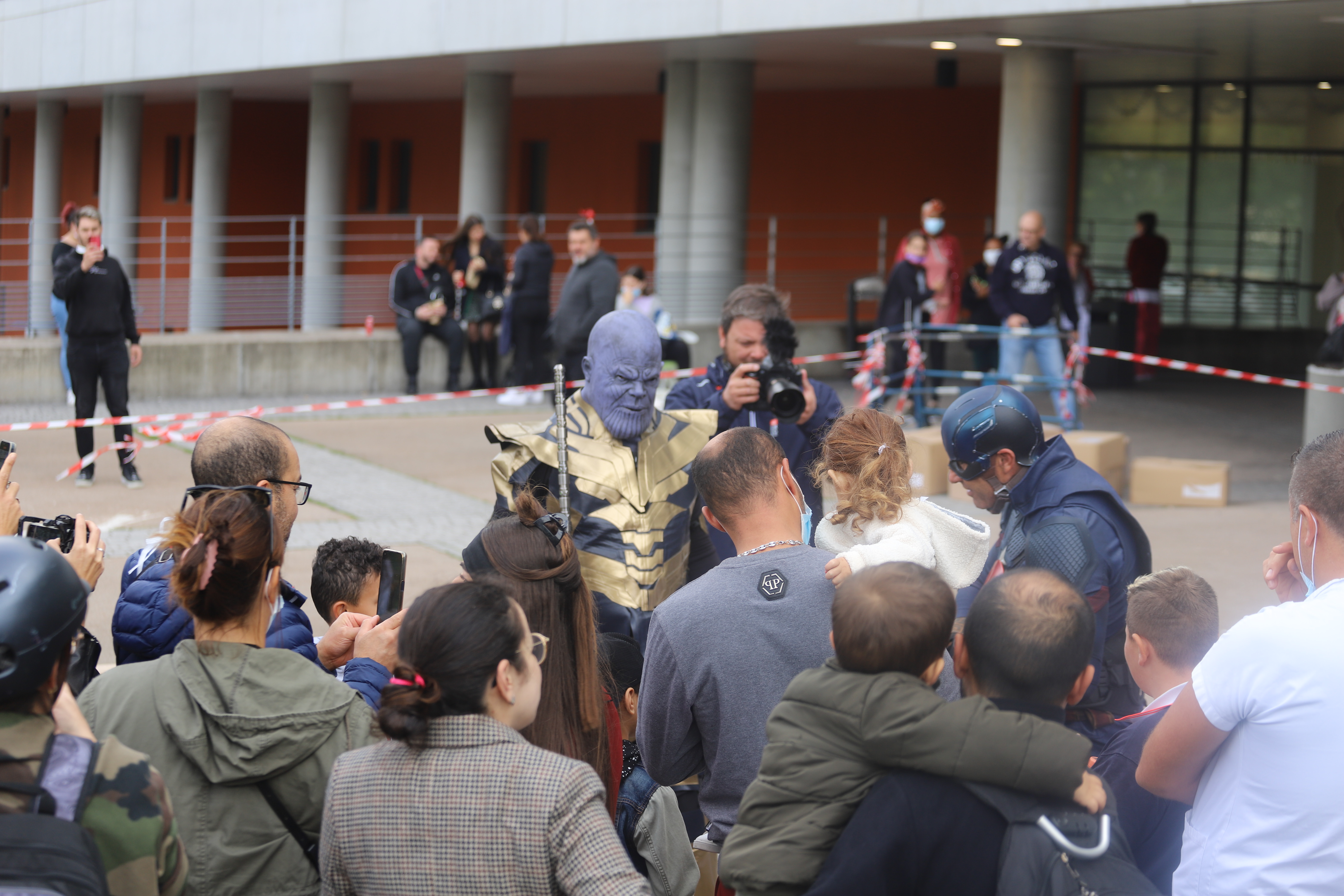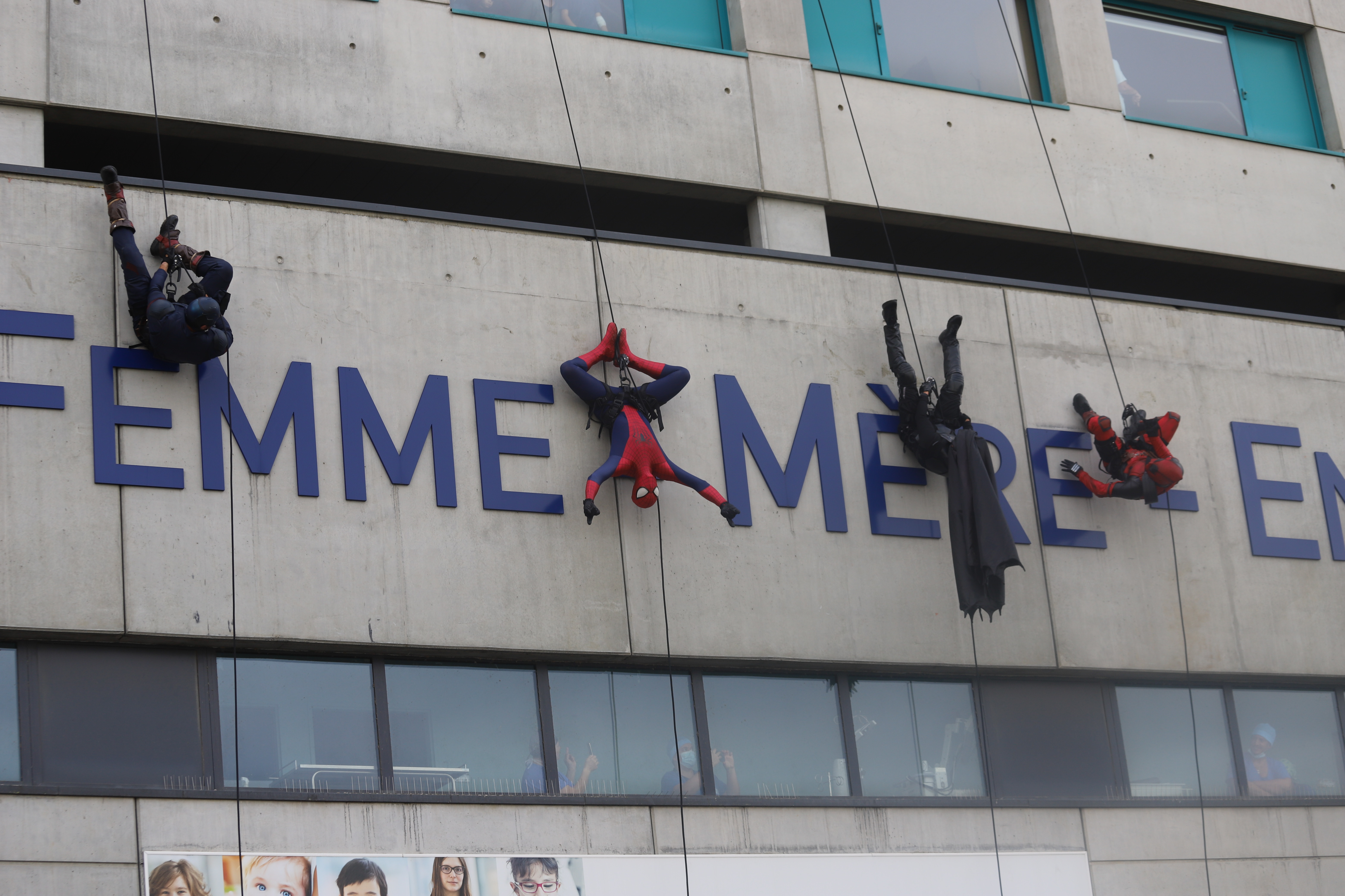 Alors que deux personnages, Thanos et Harley Quinn, ont joué les méchants et ont fait semblant de s’en prendre aux enfants, les super-héros sont venus à leur rescousse en descendant en rappel la façade de l’hôpital. Après un faux combat, les deux clans ont décidé de faire la paix et d’échanger avec les malades.