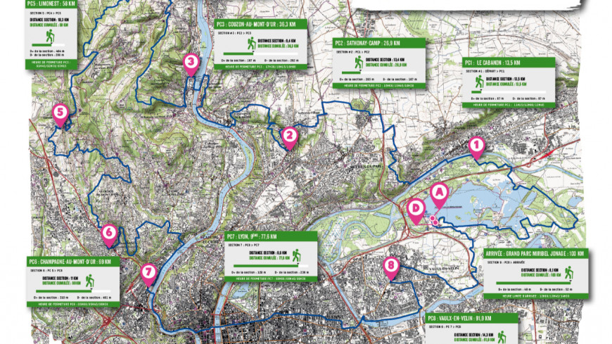 "Une marche de jour et de nuit sans relais à travers des zones vallonnées jusqu’au territoire plus urbain de la Métropole de Lyon. Un véritable défi sportif vous attend avec un dénivelé intéressant, 2 000 m de dénivelé positif cumulé" d’après l’organisation de l’événement.