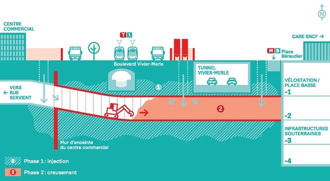 La société SPIE Batignolles doit donc creuser une galerie souterraine de 60 mètres transformée en tunnel à sens unique, réaliser un ouvrage de raccordement au tunnel Brotteaux-Servient, ainsi qu'une extension du couloir du métro B. Le creusement démarre ce lundi et doit durer jusqu'à la fin de l'année 2023. Après avoir réalisé la tête du tunnel au niveau de la sortie du tunnel Brotteaux avec des techniques classiques de génie civil, les mineurs attaqueront la phase de creusement en terminant de renforcer le bloc, permettant ainsi d’éviter toutes dégradations sur les ouvrages sous lequel le tunnel passe. Au fur et à mesure de son renforcement, ils effectueront le percement et l’évacuation des déblais. C’est durant cette période que la fermeture complète du tunnel Brotteaux/Servient est nécessaire.