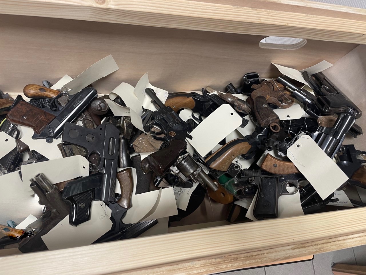 Parmi les dépôts en ce début de semaine une carabine "léguée par l’arrière-grand-père", une autre "achetée en 1978" selon son propriétaire, ou encore ce revolver datant de 1943, estampillé d'un symbole nazi et ramené au commissariat par un couple. Quelques armes de guerre ont aussi été déposées depuis samedi, notamment un fusil semi-automatique et des cartouches de très gros calibre. L'affluence est telle, comme dimanche "où une longue file d'attente de personnes armées s'étendait devant le Fort" selon une gradée, que des renforts ont été envoyés pour grossir les rangs des agents chargés de la manutention.