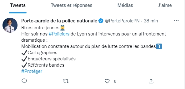 La porte-parole de l’institution, la commissaire divisionnaire Sonia Fibleuil, a d’abord tweeté sur un fait-divers inquiétant qui se serait déroulé à Toulouse mercredi soir. La gradée évoquait alors une "rixe entre jeunes", durant laquelle un "affrontement dramatique" aurait eu lieu, laissant craindre un lourd bilan humain. Une information très partielle, suivie des détails sur la "mobilisation constante" de la police sur ce sujet : " cartographies, enquêteurs spécialisés, référents bandes".