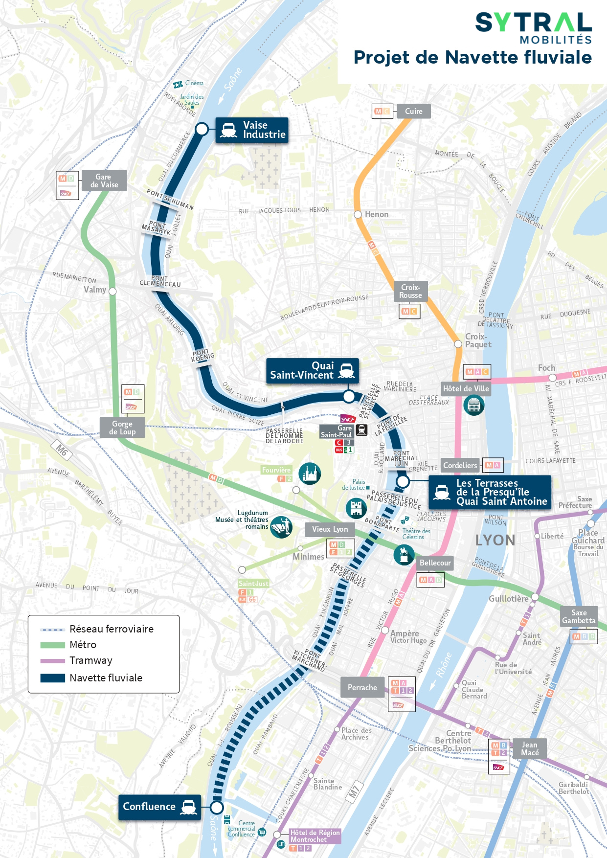 Longtemps voulu lors de précédentes mandatures, ce vieux serpent d’eau douce va enfin voir le jour. Trois premiers arrêts seront desservis par les bateaux : Vaise industrie, le quai Saint-Vincent et le quai Saint-Antoine soit 3,4 kms de trajet, avec la possibilité de créer un 4ème arrêt jusqu’à Confluence, soit 2,5 kms supplémentaire.