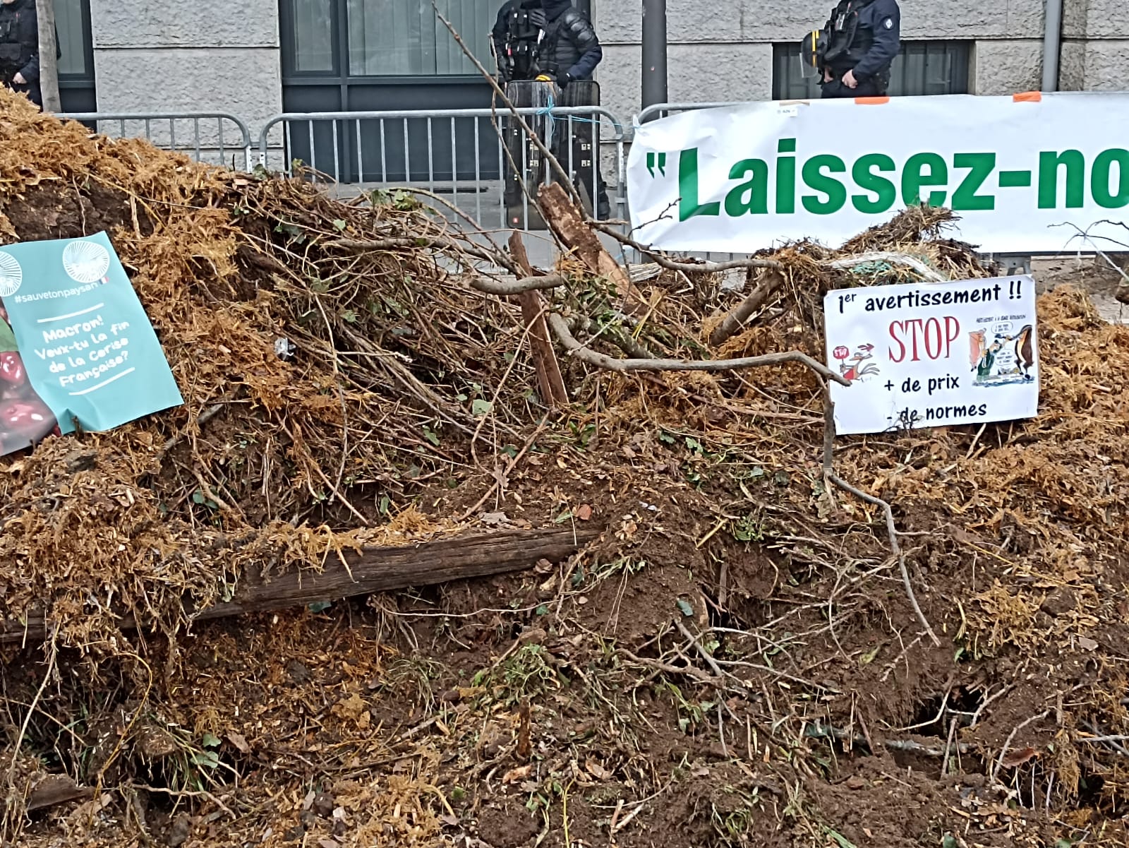 Après trois opérations escargots parties de Brignais, Beynost et La-Tour-de-Salvagny, les agriculteurs se sont positionnés devant la DREAL aux Brotteaux. Là, des déchets verts ont été déversés. Ce sont plusieurs tonnes de terre, branches, souches et broussailles qui ont été installées devant le bâtiment du 6e arrondissement de Lyon.