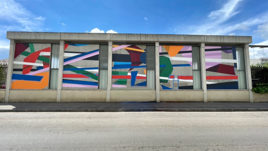 Cette fois-ci, ce sont des jeunes âgés de 15 à 25 ans qui souffrent de troubles d’adaptations, de légers handicaps ou sont en situation d’échec qui ont réalisé cette œuvre, encadrée par l’artiste Chuffy. La fresque aux formes géométriques et colorées, reflète les déplacements quotidiens, en se croisant, se suivant où se juxtaposant.