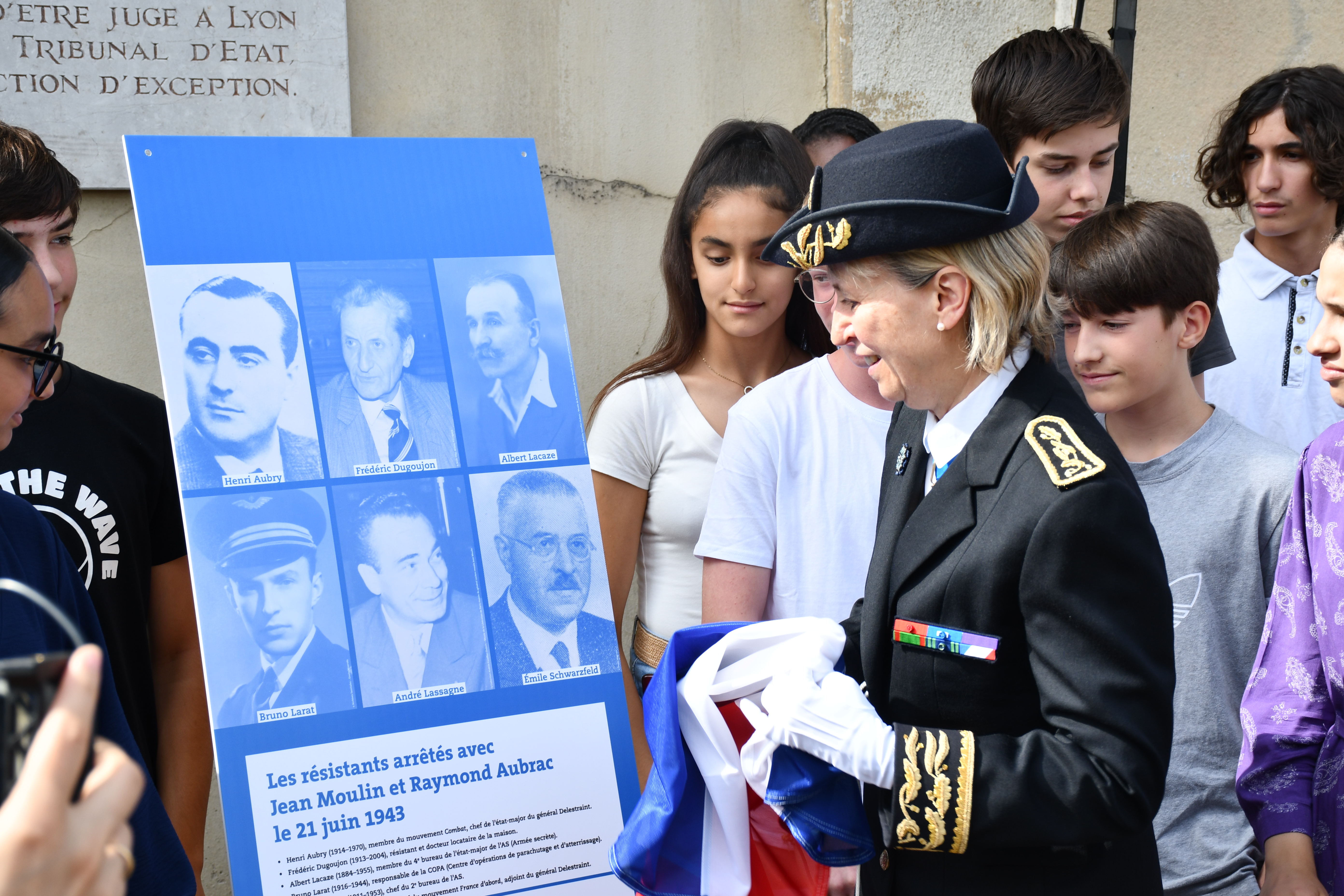 Ce mercredi, des élèves des collèges Jean Moulin de Villefranche-sur-Saône et André Lassagne de Caluire-et-Cuire étaient présents. Ils ont déclamé les biographies du créateur du Conseil national de la Résistance, mais aussi des personnes arrêtées en même temps que lui, dont notamment Henri Aubry, Frédéric Dugoujon, Albert Lacaze, Bruno Larat, André Lassagne et Emile Schwarzfeld. Une plaque leur rendant hommage a d’ailleurs été dévoilée par la préfète du Rhône Fabienne Buccio.
