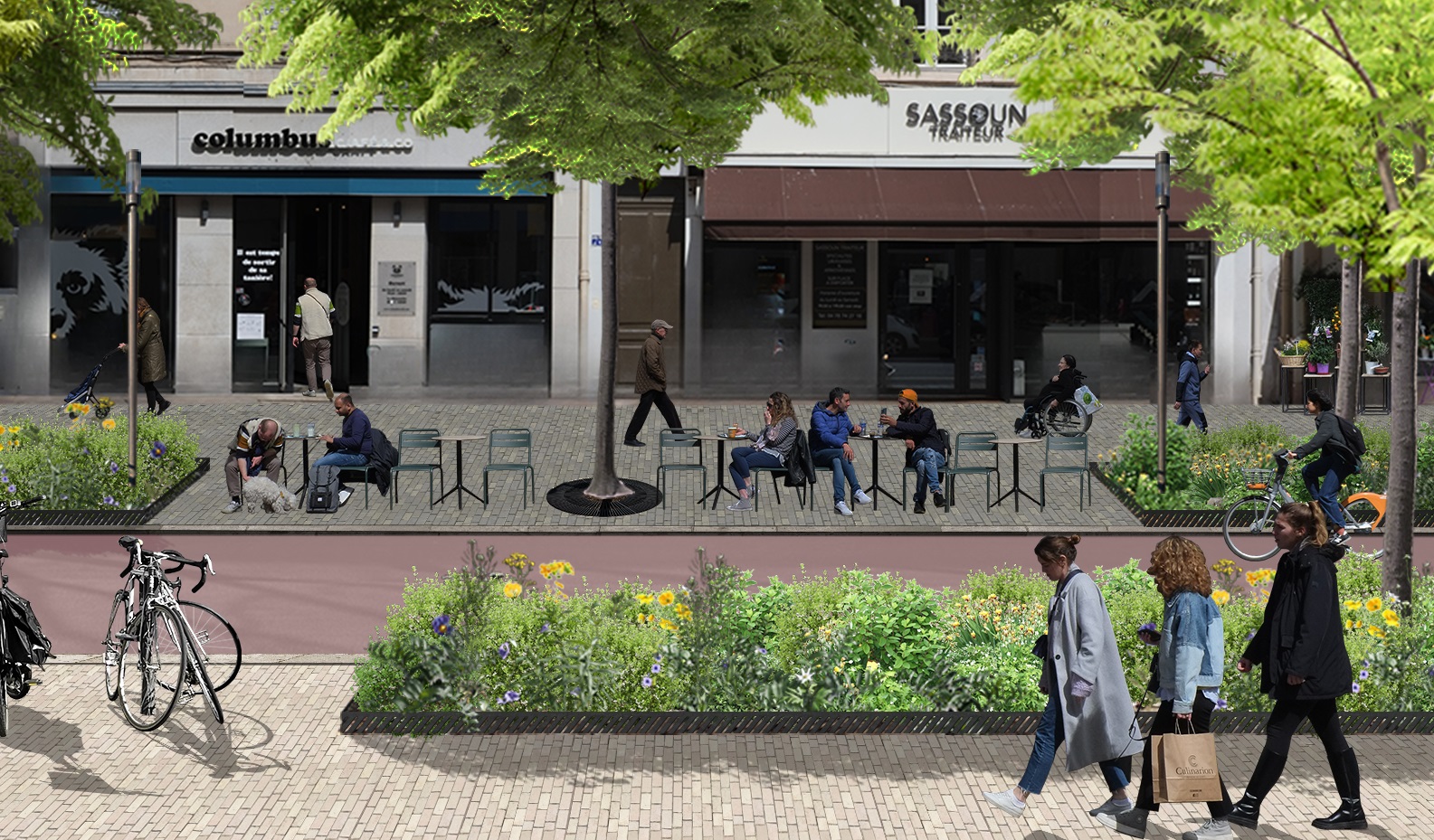 La Métropole et la ville ont opté pour un espace partagé entre voitures et vélos, mais sous certaines conditions. Tout le long de l’axe, le principe de "vélorues" prévoit d’être appliqué : les vélos, qui pourront circuler en double sens, seront prioritaires sur la voiture, et cette dernière aura interdiction de les dépasser. Aucun marquage au sol n’apparaît sur les maquettes.