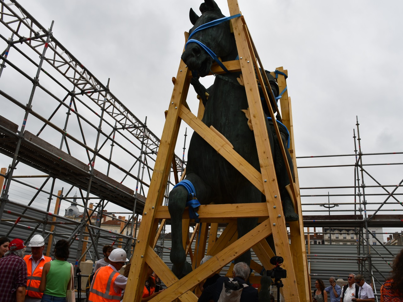 Installés sur la plus grande place de Lyon depuis 1825, Louis XIV et sa monture ont été pour la première fois ôtés de leur socle. La statue mythique de la ville a subi ces dernières années de nombreuses difficultés. Depuis 2015, des problèmes techniques surviennent tantôt à cause la pluie, tantôt à cause des anciennes techniques de nettoyage. Ces derniers ont ainsi été confirmés en 2019.