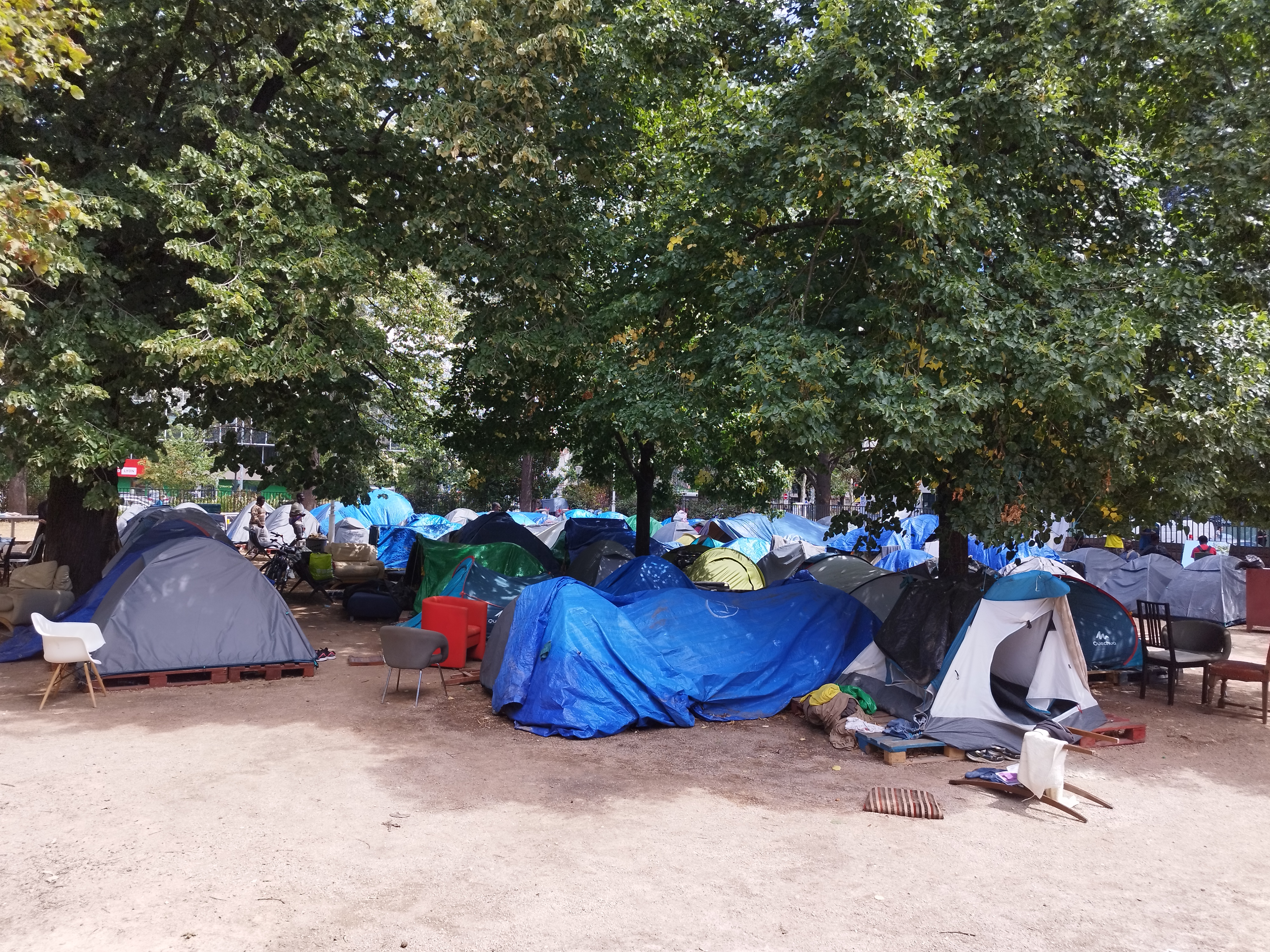 Initialement installés sur l'esplanade de l'Hôtel de la Métropole de Lyon, ils en avaient été expulsés par les CRS au cours du mois d'avril. Depuis, ils logent au beau milieu du square Sainte Marie Perrin dans une cinquantaine de tentes. Selon le Collectif, ils seraient près d'une centaine de mineurs sans domicile fixe à avoir élu domicile dans le campement.