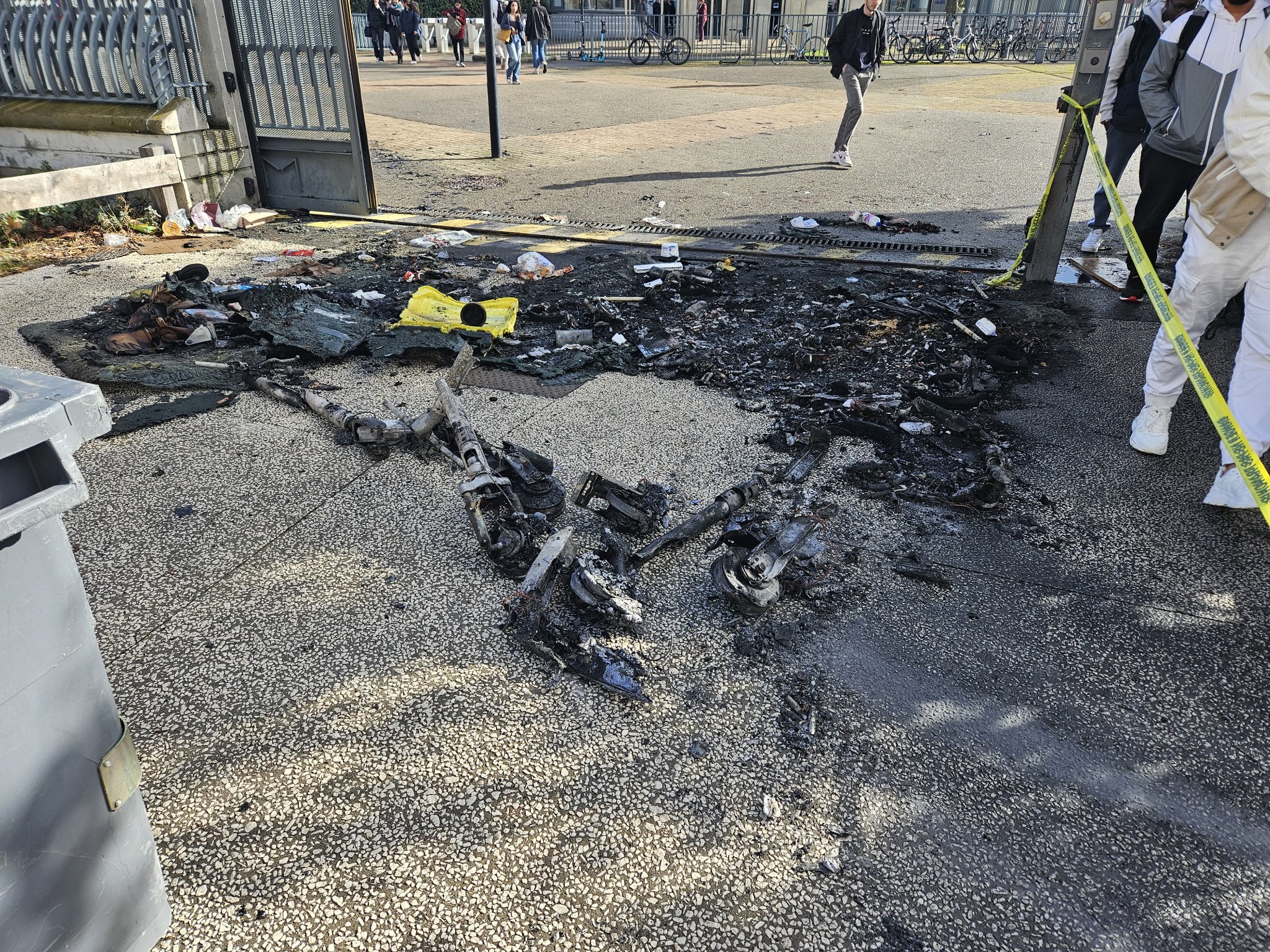 Des poubelles et de nombreuses trottinettes électriques ont été incendiées à proximité immédiate des grilles.