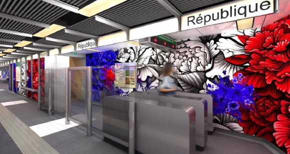 Pour République Villeurbanne, c'est une fresque de l'artiste Julien Soone qui habillera la station avec ce projet signé Metropolis Architectes Associés, Berga, Eclisse Ingenierie SARL et Atelier Soone 55/313. Il leur avait été demandé de travailler sur le thème de la poésie urbaine.