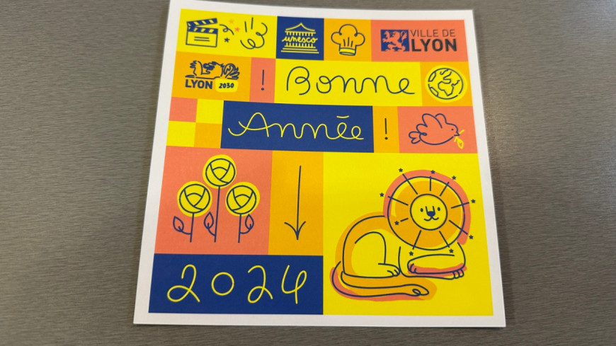 La Ville de Lyon n'a pas dérogé à la règle pour son visuel de 2024, très jaune et représentant un lion dont la crinière rappelle la grande roue de la place Bellecour.