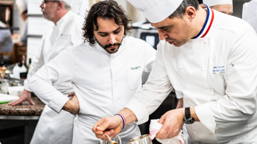 Ce jeudi premier février, le restaurant Paul Bocuse soufflait sa centième bougie : pour rendre hommage dignement à Monsieur Paul, un trio d'exception a pris le contrôle des cuisines. Et leur mission était de taille : récréer le menu Élysée du 25 février 1975, créé à l'occasion de la remise de la médaille de Chevalier de la légion d'honneur à Paul Bocuse par Valéry Giscard d'Estaing.