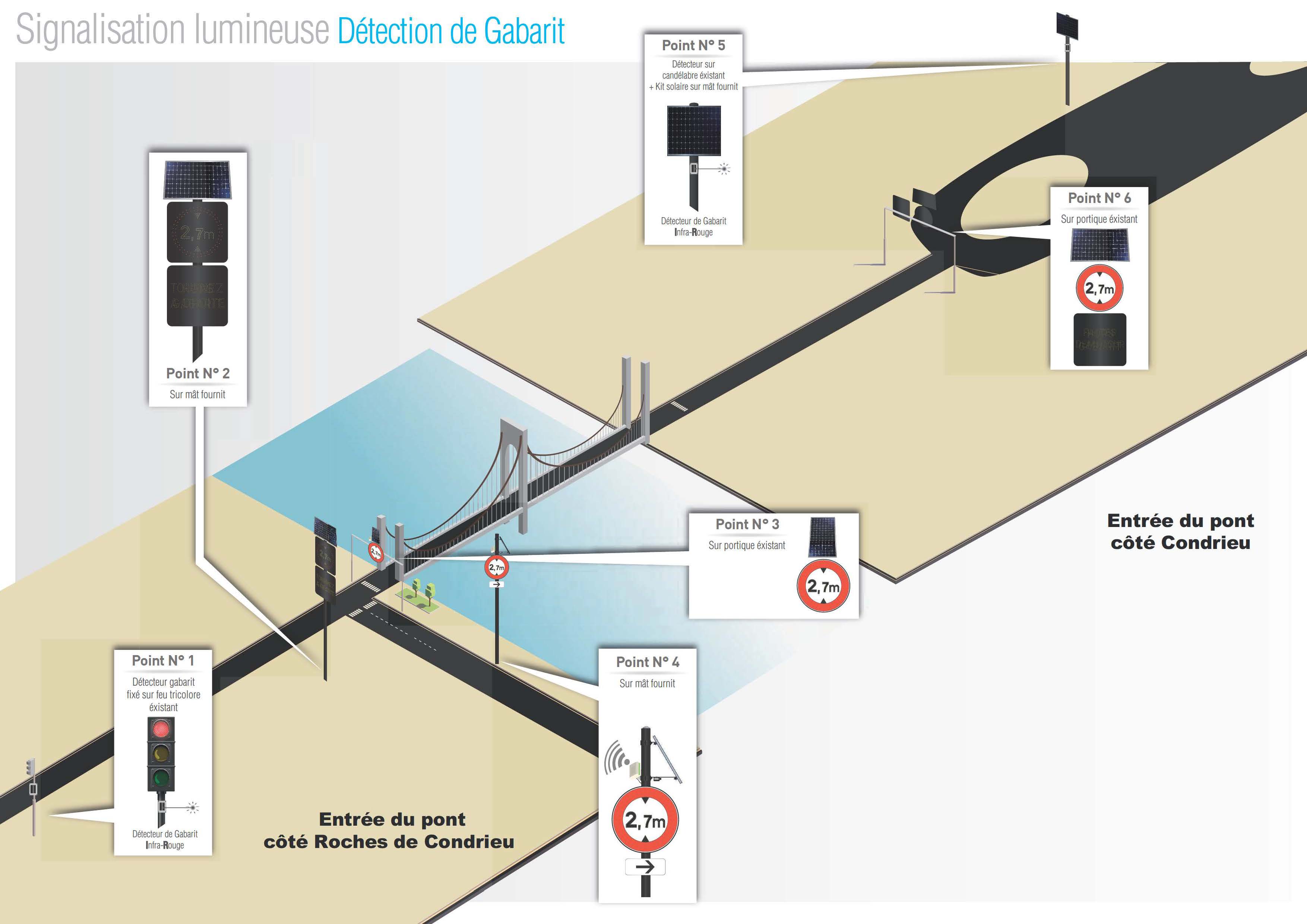 Le Département du Rhône a donc décidé d'innover avec des détecteurs de gabarits et des panneaux dynamiques. Installés dès ce mercredi et jusqu'à vendredi, ils seront installés en hauteur, et en amont des entrées du pont. Un capteur infrarouge pourra alors détecter tout véhicule excédant les 2,70 mètres de hauteur autorisés, et activera les panneaux dynamiques indiquant des messages conseillant au conducteur de faire demi-tour.