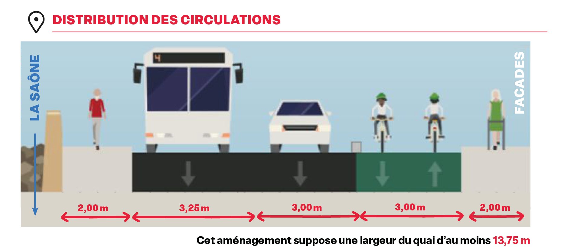 Au final, les trois scénarios sur la table prévoient plus ou moins un bouleversement pour les quais Tilsitt et Joffre. Le scénario 2, qui récolte le moins de "points négatifs" de la part de la Métropole, est le seul qui prévoit un maintien à 70/80% du stationnement actuel. Il prévoierait une voie de bus de 3,50 mètres le long de la Saône en cohabitation avec les cyclistes, deux voies automobiles de 3 et 2,10 mètres, et enfin une voie cycliste d'1,90 mètre à contresens, en direction de Bellecour.