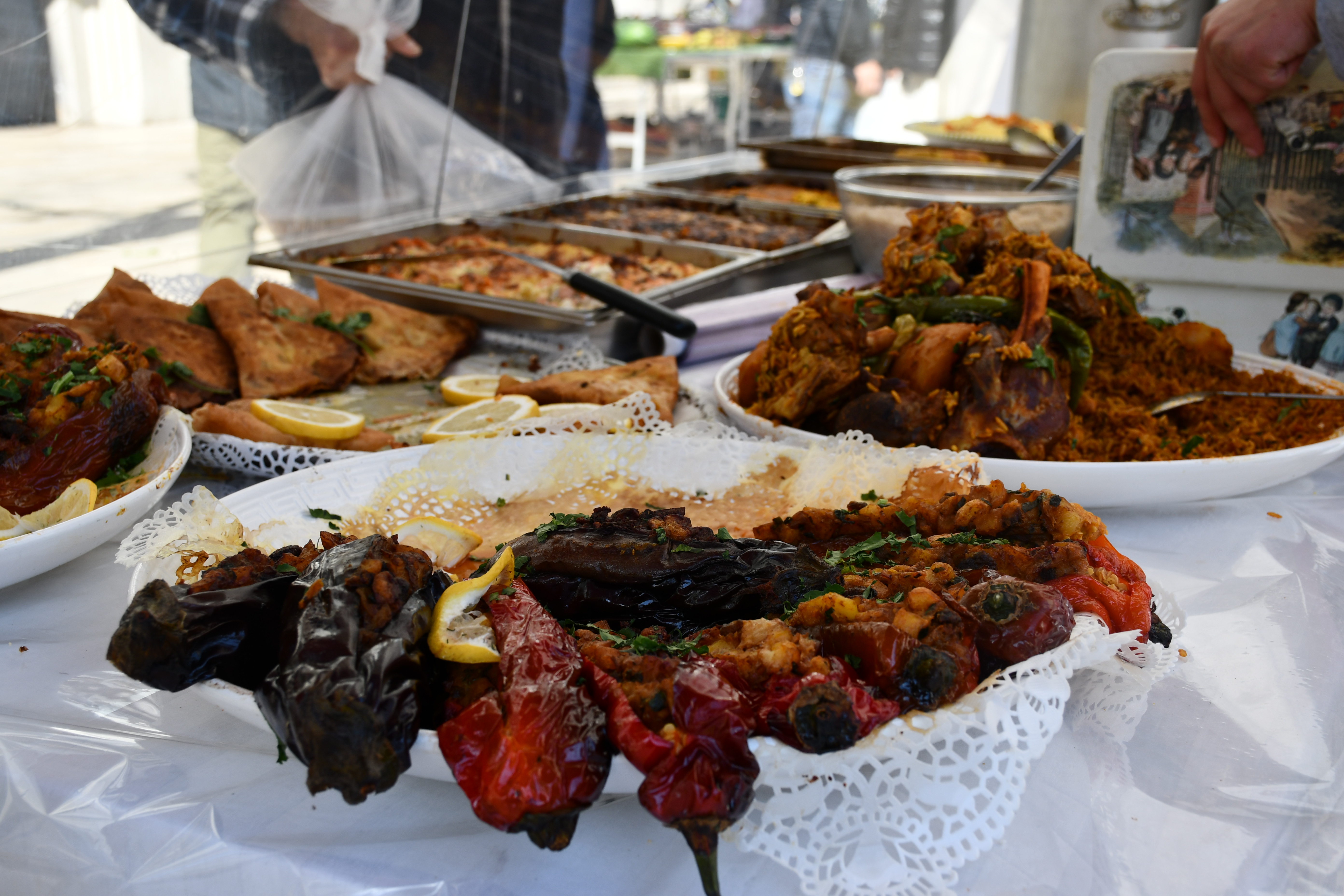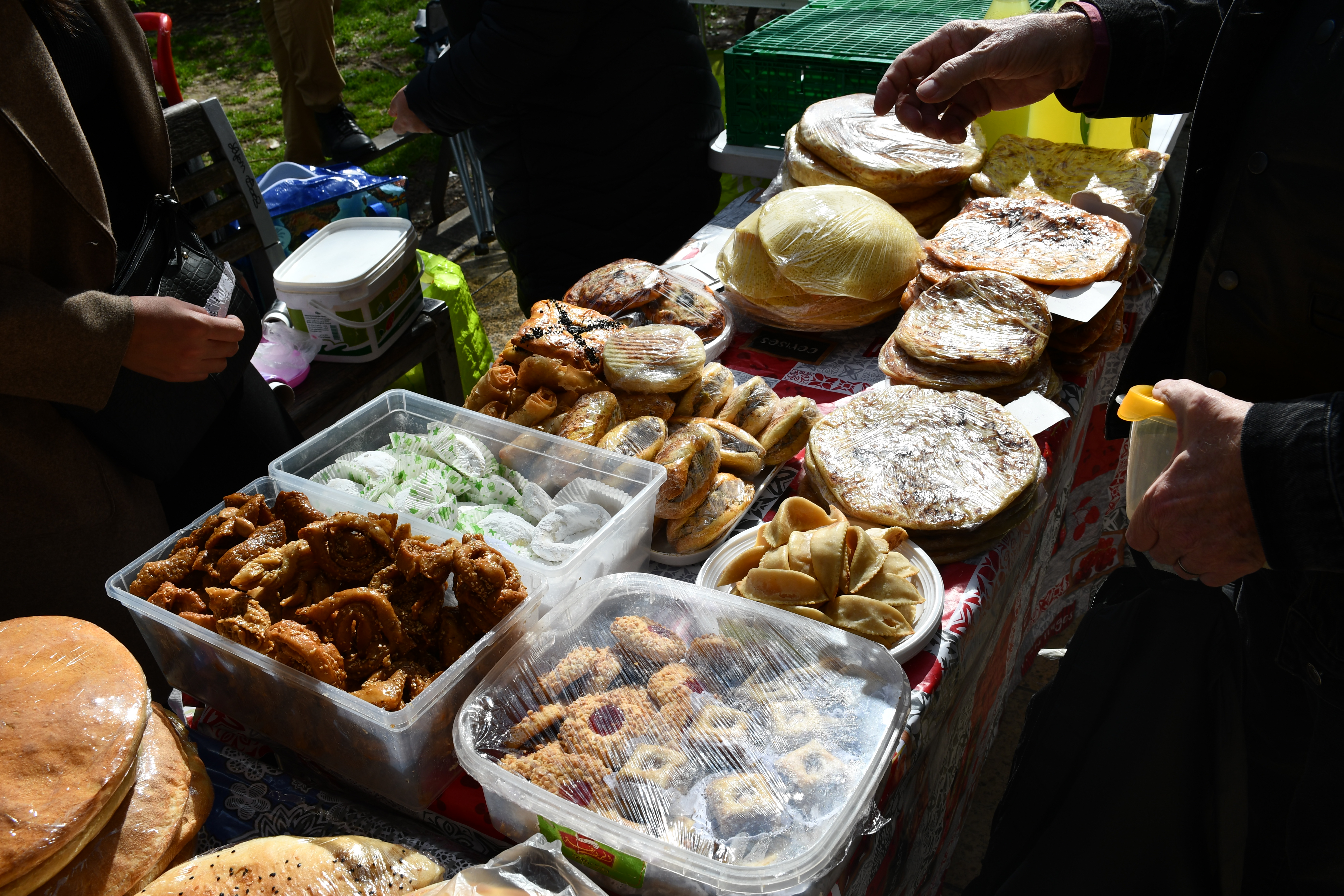 C’est au détour d’une discussion entre deux stands de pâtisseries que Karim se dirige vers le sien : "J’ai ramené du miel d’Algérie, produit sans aucun pesticide", dont les pots sont aromatisés à différentes saveurs : roquette, eucalyptus ou encore jujubier. Le marché voit cohabiter de nombreux stands réunissant les cuisines du Maghreb et d’ailleurs. Cornes de gazelle, kesras, baklawas… Les douceurs et autres produits sont vendus à la criée à une clientèle autant pratiquante que non-musulmane.