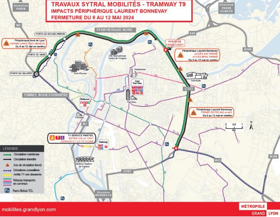 Entre la porte de Croix-Luizet et la porte du Valvert, la circulation sera maintenue dans le sens Est/Ouest mais interdite dans l'autre sens. Et sur la portion Croix-Luizet/A43, la circulation sera maintenue dans le sens Nord/Sud, mais interdite dans le sens Sud/Nord.