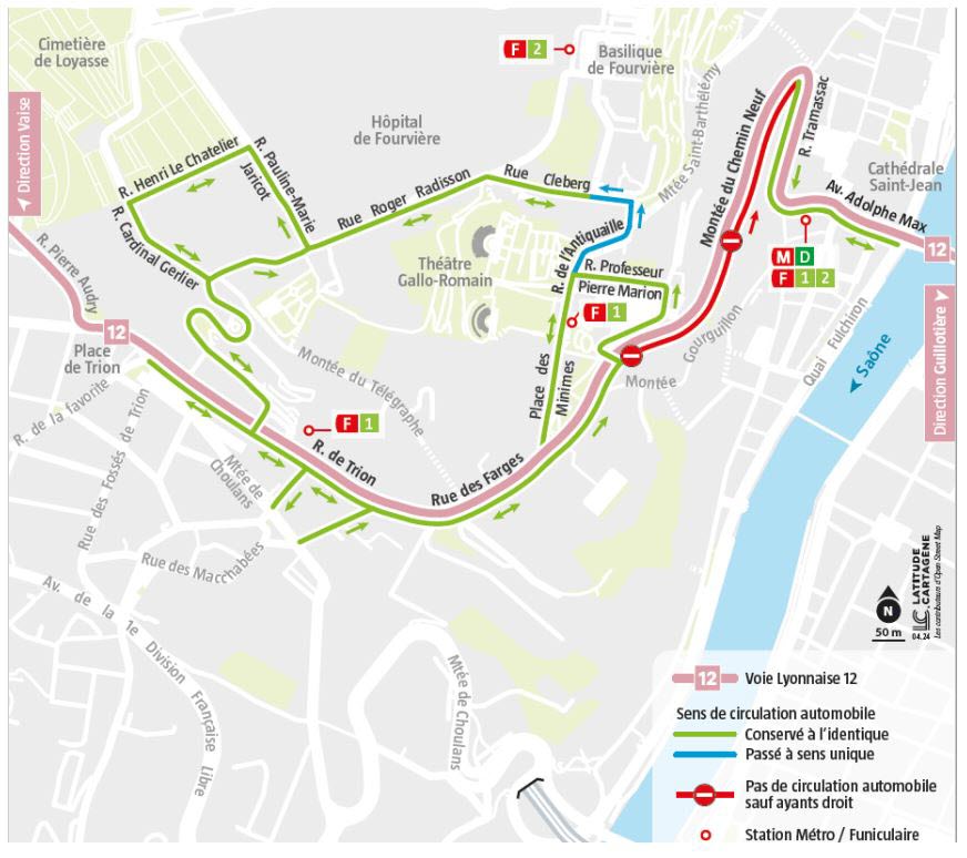 Le nouveau plan de circulation, qui prévoit aussi le passage à sens unique du haut de la rue de l'Antiquaille, sera testé durant 9 mois après le festival des Nuits de Fourvière cet été.