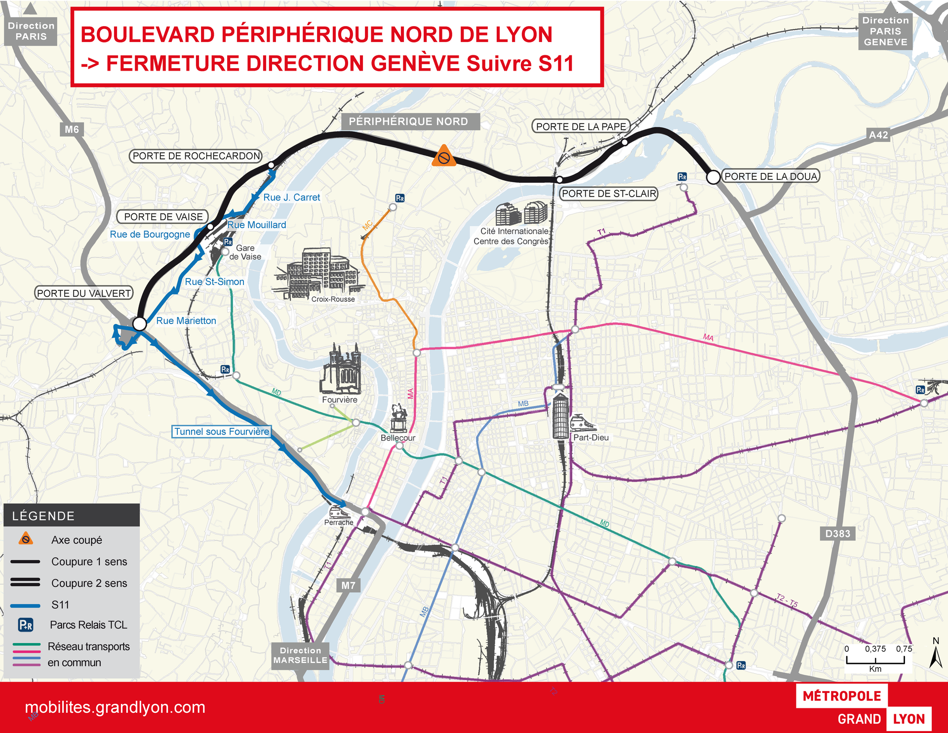 Entre la porte de Croix-Luizet et la porte du Valvert, la circulation sera maintenue dans le sens Est/Ouest mais interdite dans l'autre sens. Et sur la portion Croix-Luizet/A43, la circulation sera maintenue dans le sens Nord/Sud, mais interdite dans le sens Sud/Nord.