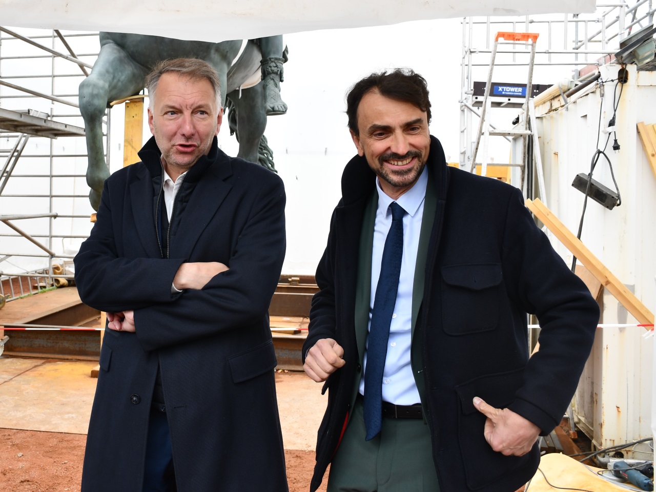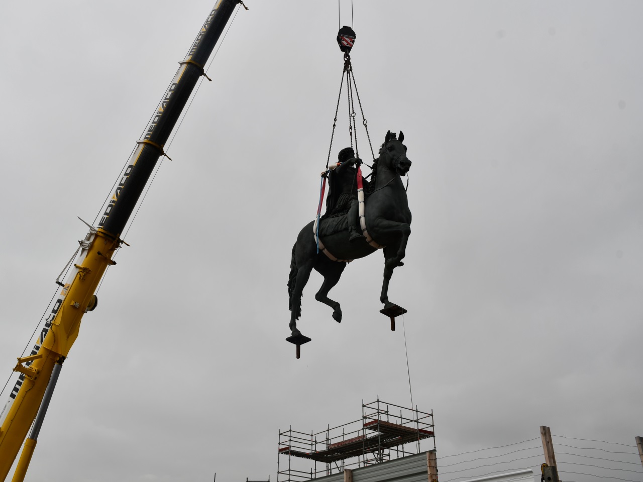 Elle était clairement la star de cette fin de matinée sur la place Bellecour. Au point que les discours des politiques présents pour l'occasion ont vite été éclipsés au profit de la manoeuvre tant attendue. "Plus personne ne m'écoute", s'est amusé Bruno Bernard, le président de la Métropole de Lyon alors que Louis XIV et son cheval retrouvaient le piédestal au centre de la plus célèbre des places lyonnaises. La statue n'était pas très loin puisque les travaux de rénovation étaient effectués dans un atelier installé sur place.