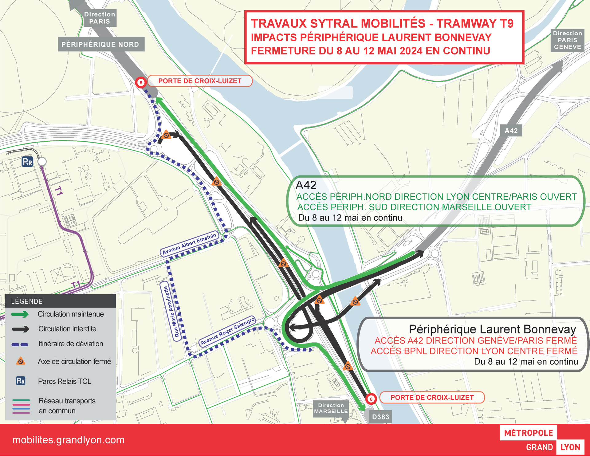 Jusqu'au dimanche 12 mai 12h, il est impossible de l'emprunter en direction de Paris/Genève entre la porte des Essarts et la porte de Croix-Luizet, et en direction de Marseille entre la porte de la Doua et la porte de Croix-Luizet. Le pont du Roulet est également fermé.
