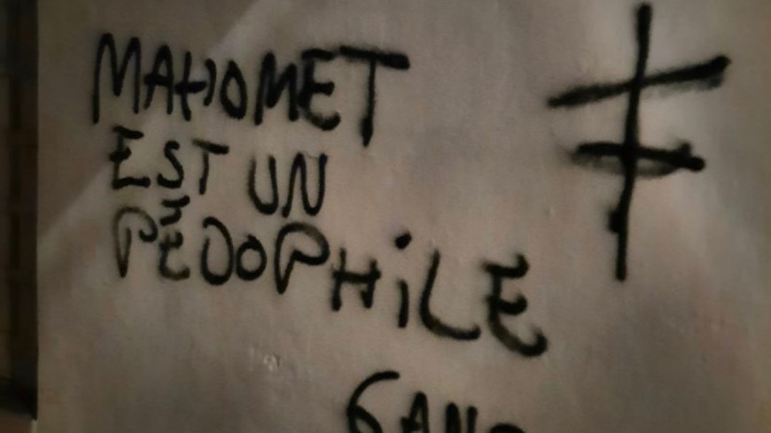 On pouvait notamment lire "Mahomet est un pédophile" et une croix de Lorraine. La mention "6 ans" fait référence à un argument de l'ultra-droite sur l'âge présumé d'Aïcha, l'une des épouses du prophète Mahomet.