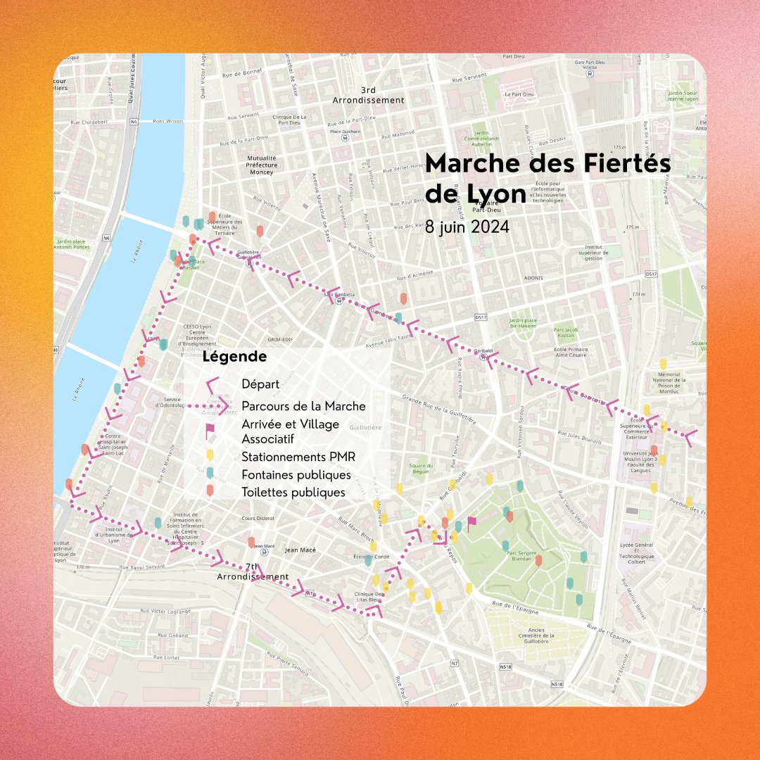 Le parcours a été modifié depuis une semaine. La Marche des Fiertés devait partir du parc de la Tête d'Or, mais c'est finalement à la Manufacture des Tabacs qu'elle s'élancera à 13h. Le cortège empruntera le Cours Gambetta jusqu'à la Guillotière, puis les quais du Rhône, pour ensuite emprunter l'avenue Berthelot et la rue Garibaldi jusqu'au point d'arrivée, le parc Sergent Blandan. Sur place, un Village des Fiertés sera installé.