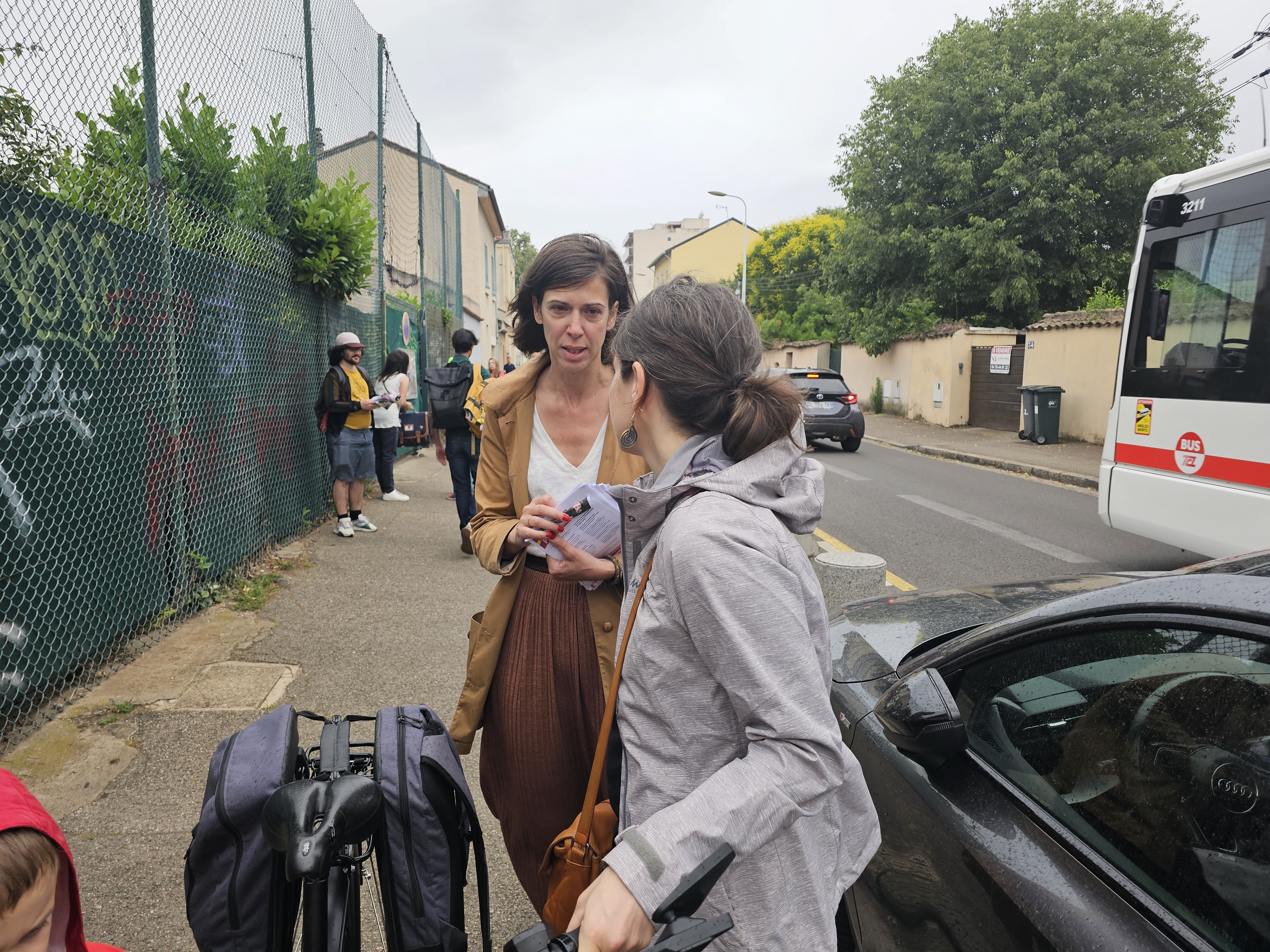 Stéphanie Léger et un militant souriant qui l’a rejoint ne se laissent pas démonter et, tracts sous le bras, rejoignent à 100m de là l’entrée où des parents chics et minces déposent des enfants dans des gerbes de bisous d’au-revoir jusqu’au soir. Sandrine Runel sur son immense vélo cargo qu’elle ne sait où garer arrive, au même moment.