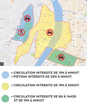 De 19h à 00h30, aucun véhicule sera autorisé sur la colline de Fourvière, s’en suivra les piétons qui ne pourront plus accéder à la colline à partir de 21h jusqu’à 23h30. Concernant les secteurs Saint-Jean et Presqu’île, pas de circulation automobile de 19h à 01h.