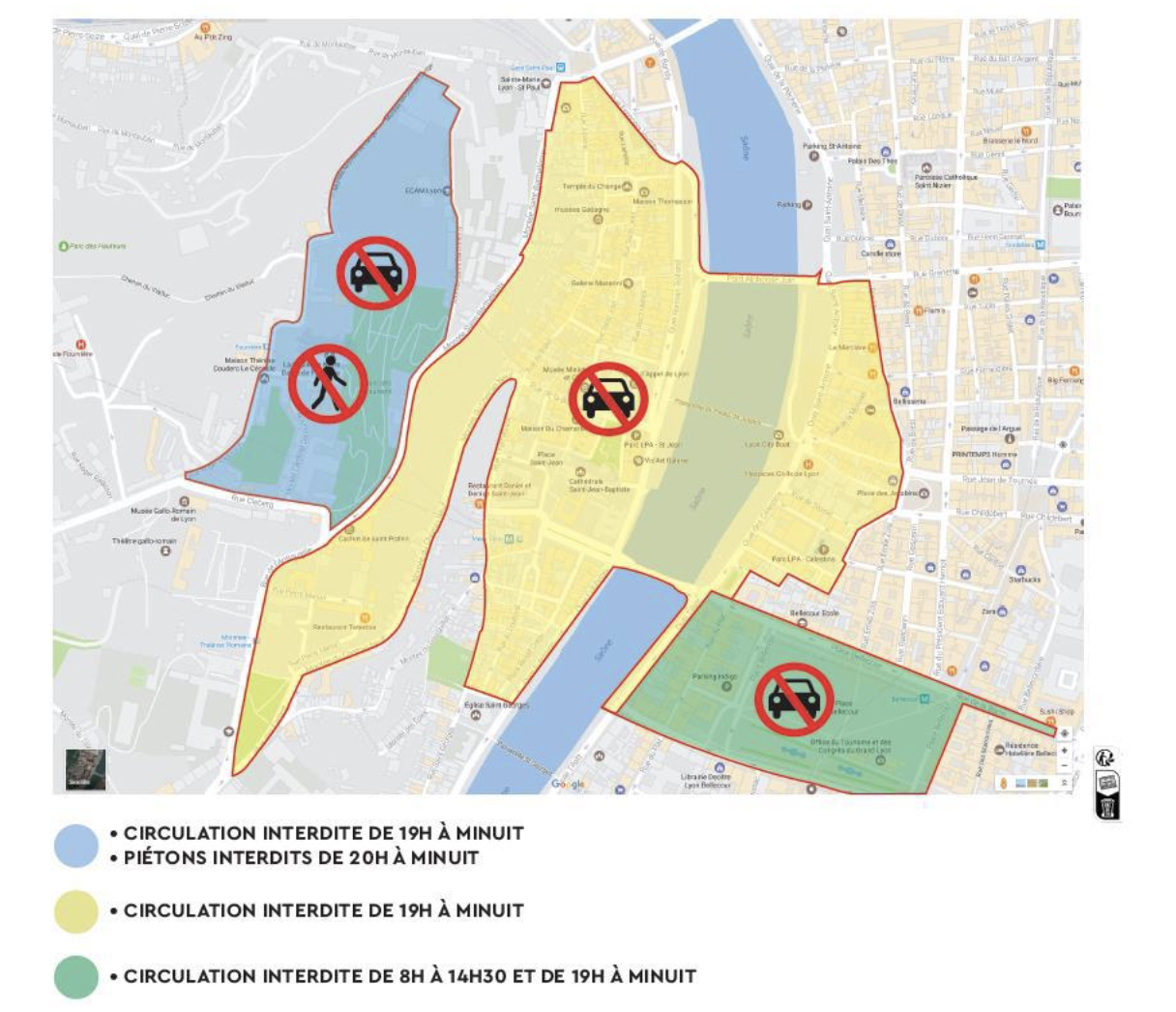 Dans le cadre des festivités, des mesures supplémentaires sont mises en place, incluant l’extension du périmètre de fermeture au nord sur les quais de Saône en raison de la fermeture de la rue Grenette à la circulation.