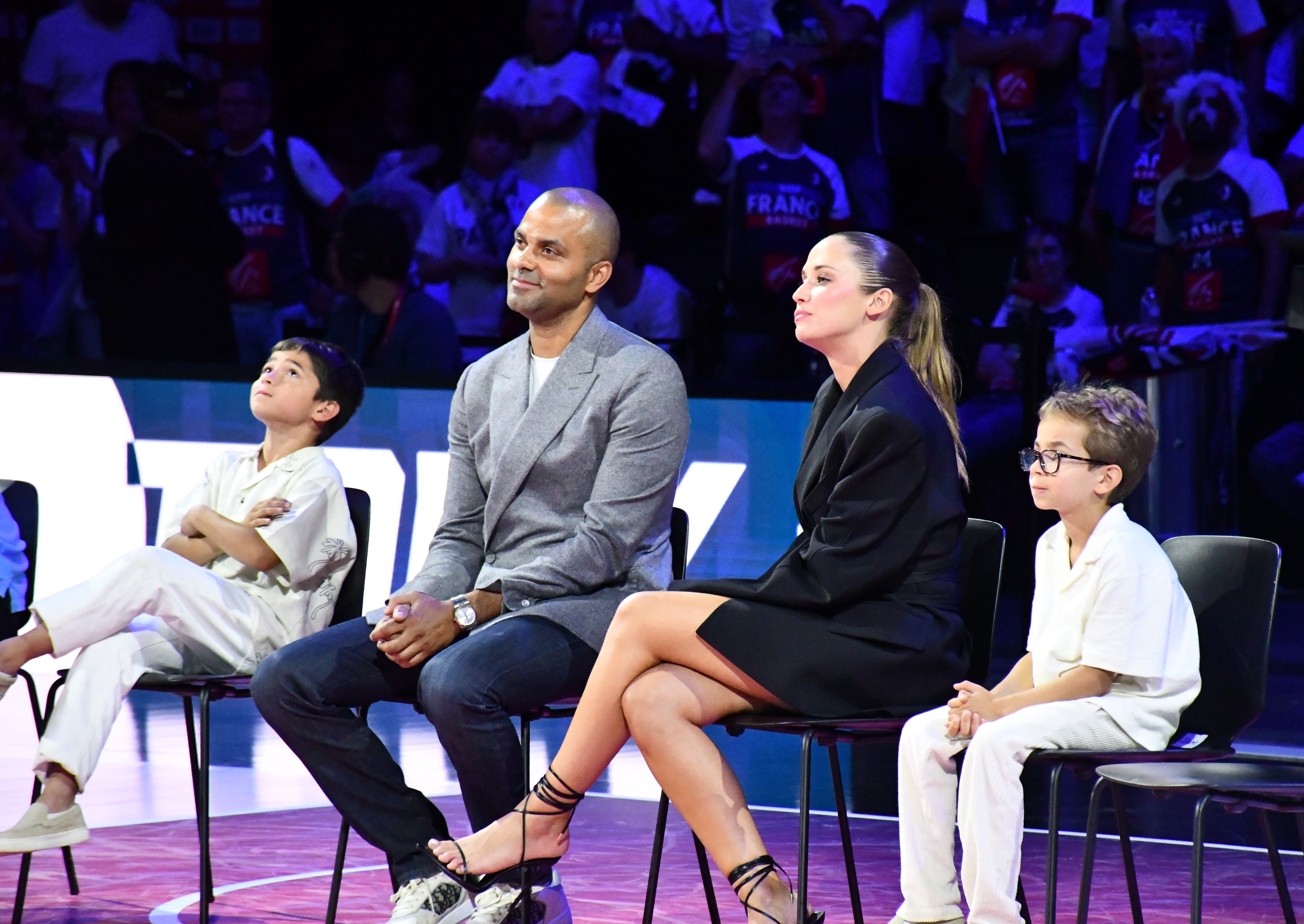 Accompagné de ses enfants et de sa compagne, Agathe Teyssier, l'ancien meneur des Spurs a été acclamé par les supporters, tous restés pour l'occasion, après la diffusion d'une vidéo retraçant les meilleurs moments de sa carrière.