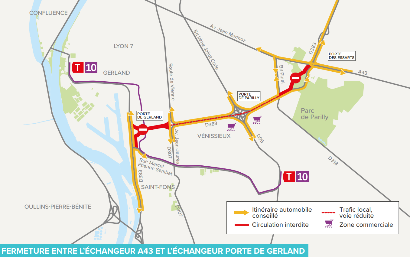 A partir de ce lundi 12 août à 3h du matin et jusqu'au dimanche 18 août à 8h du matin, l'axe sera fermé aux automobilistes, dans les deux sens, entre l'échangeur A43 et l'échangeur Porte de Gerland. La circulation venant du nord sera déviée vers l'A43, la Rocade Est et le boulevard urbain sud. Celle venant du sud ne pourra pas s'engager sur l'axe.